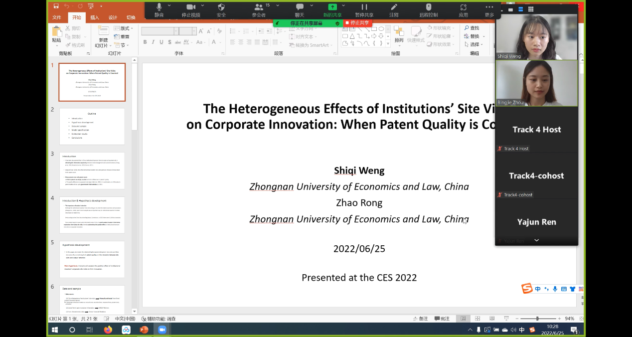 文澜学院21级硕士研究生翁诗棋同学于北京时间2022年6月25日至26日,参加了中国留美经济学会2022年会(2022 CES Annual Conference)的两个分会场报告。翁诗棋同学作为报告人,于分会场A.4 “Corporate innovation”,做了题为“The Heterogeneous Effects of Institutions’ Site Visits on Corporate Innovation: When Patent Quality is Counted”(合作者:文澜学院荣昭教授)的学术报告。本分会场的参与学者分别分享并讨论“Employee Stock Options and Corporate Innovation: Evidence from China”,“M&A Goodwill and Corporate Innovation: An Inverted-U Relationship”,“Evolutionary Game Analysis on the Cross-organizational Cooperative R&D Strategy of General Purpose Technologies under Two-way Collaboration”等前沿研究。