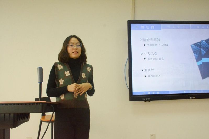 第二位分享的是经管1901班陈子扬同学,他从保研介绍、个人经历、科研实践和学科竞赛四个方面向大一同学们分享了保研经验,并且用“平稳”、“波折”和“忙碌”三个词语分别概括了他大学三年的生活,告诉同学们要放平心态,稳扎稳打,逐步适应大学生活,早日找到属于自己的节奏。紧接着,陈子扬同学介绍了他丰富的科研实践和学科竞赛的经验,为有意愿向此方向发展的大一同学提供了可借鉴的经验,指明了努力的方向。最后,陈子扬同学用四个简洁的英语短语向大家提出了四条宝贵的建议,巧妙地阐释了成功的秘诀。