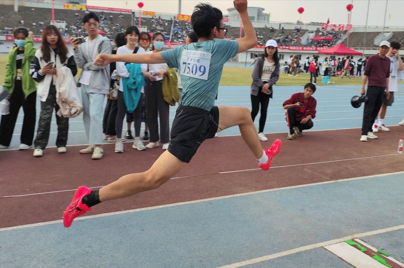 每一步腾跃,积攒的不只是力量,还有激情;每一步腾跃,迸发的不只是速度,还有斗志;每一步腾跃,挥洒的不只是汗水,还有青春。起跳,奋力向上向梦想进发;腾空,腾跃而起向目标飞去。邹文达同学在三级跳赛场上的每一步都迎着胜利的朝阳,跨步一跳,跳出了文澜学子的自豪,稳稳落地,成为文澜学院的骄傲。在男子三级跳比赛中,邹文达同学为文澜学院斩获了本届运动会的第一块银牌!