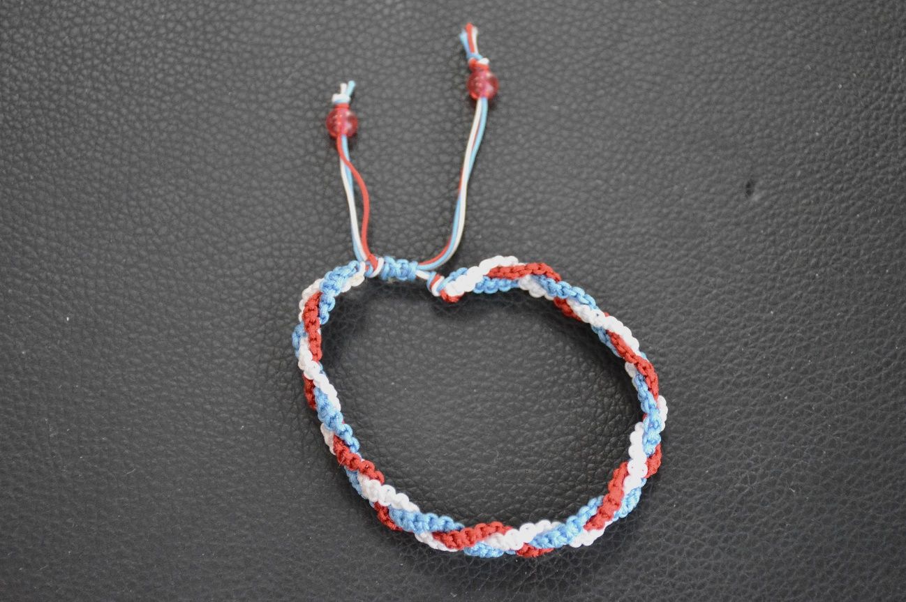 介绍结束后,同学们观看着电脑上播放的手绳编织教学视频,尝试着把对折的长绳穿过短绳,交叉后将压在下的长绳绕着短绳穿过小孔,轻拉长绳的一端,将长绳缠绕在短绳上,就编成了一个小结。绳结丝丝入扣,看似精巧可人,实则并不简单。在编织的过程中,同学们反复穿拉,又拆掉不工整的绳结,反复调整,最开始松垮的大环就变成了最后紧凑的小结,穿上精心搭配好颜色的珠子,一串串精美的手绳就完成了。