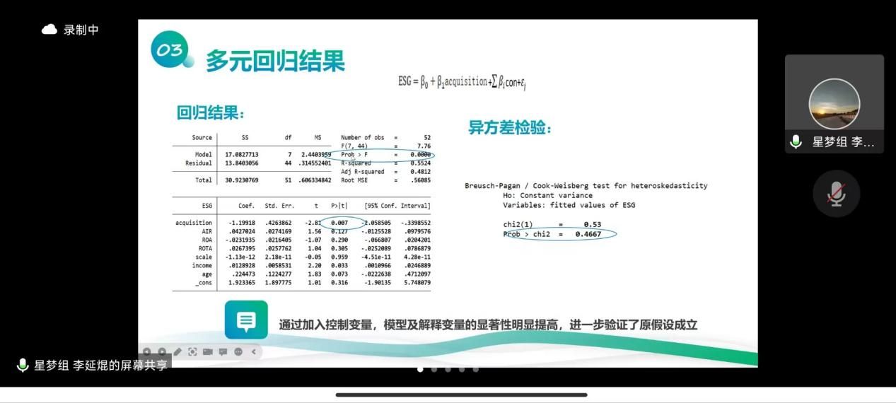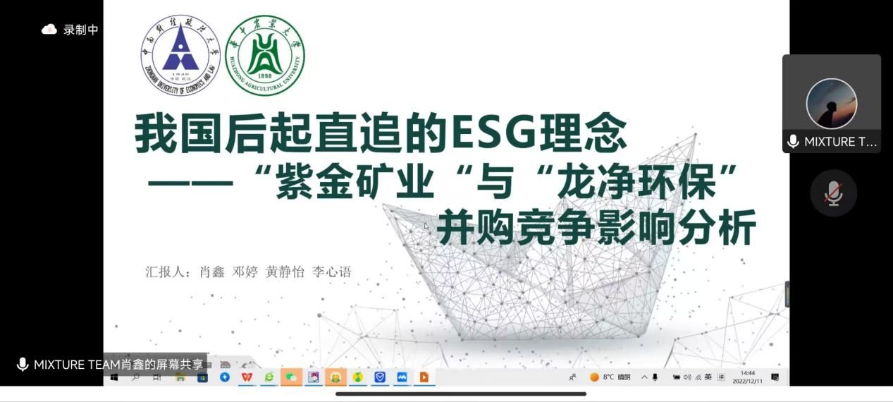 星梦组的李延焜同学以复星收购博毅雅为切入口,从企业 ESG表现的角度,运用数学建模得到多元回归结果,并据此总结了此类收购行为对行业内以及上下游行业竞争带来的影响;过关斩将队的邹晓玟同学基于碧桂园收购福建东飞的实证研究,分析了ESG背景下的绿色并购绩效以及并购对碧桂园核心影响力的影响;今天你摆烂了对不队的张丹云同学运用PEST模型、波特五力模型、SWOT模型分析了ESG背景下美的收购天腾动力的转型之路;绿力同心队的乔佳欣同学基于ESG背景下波特五力模型,分析了国科高轩收购的案例;MIXTURE TEAM的肖鑫同学对紫金矿业与龙净环保并购竞争影响进行研究,分析了我国后起直追的ESG理念;我说的队的高翔云同学,对ESG背景下企业收购的动因及效应进行分析。