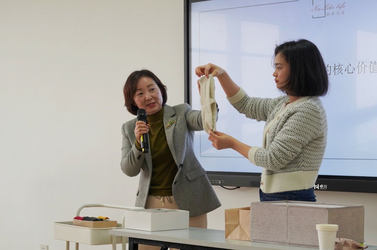 而后,主讲人、武汉纳样生活团队负责人向汉华老师为同学们讲解了整理收纳的含义、宿舍空间了解及三大收纳原理、宿舍收纳好物推荐、物尽其用生活智慧以及叠衣实践操作环节。