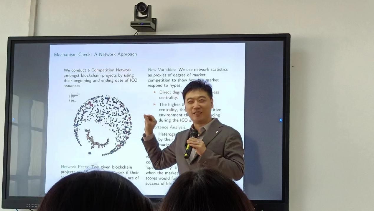 本次讲座首先由莫婷婷教授简单介绍了汪教授的研究领域。随后,汪通教授向在座教授以及同学分享了第一篇论文“Assessing the Impact of Hype on Blockchain-based Cryptocurrency:The Case of Initial Coin Offerings”。他首先向听众介绍了ICO的概念以及自己的研究方向,然后向大家强调了理论角度上“tension”的存在对于一篇论文的重要性。随后从工具变量的选取以及去除变量内生性的角度重点介绍了全文的研究思路,最后分享了该论文得出的结论。