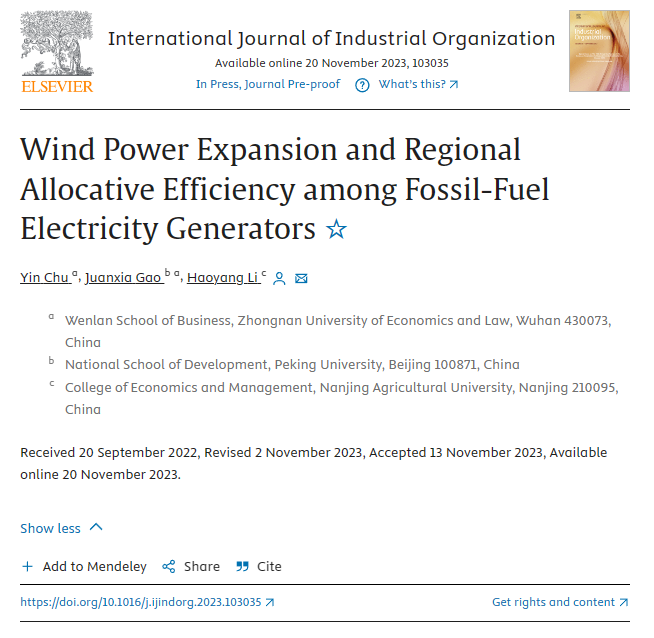 近日,文澜学院2018级本科生高涓夏同我院褚印副教授、南京农业大学李昊洋教授的合作研究成果“Wind Power Expansion and Regional Allocative Efficiency among Fossil-Fuel Electricity Generators”被产业经济学领域国际权威SSCI期刊《International Journal of Industrial Organization》接受并在线发表。《International Journal of Industrial Organization》为米兰电竞·(中国区)经济学科认定的A级外文学术期刊,是产业经济学领域国际公认的顶尖期刊之一,对该领域的研究和实践产生了重要影响。在校期间,高涓夏同学曾在2021年美国南方经济学协会(Southern Economic Association)年会上汇报该论文,并获得了良好的建议和修改意见;该论文早期版本作为高涓夏同学的毕业论文,被评为2022年米兰电竞·(中国区)优秀学士学位论文。