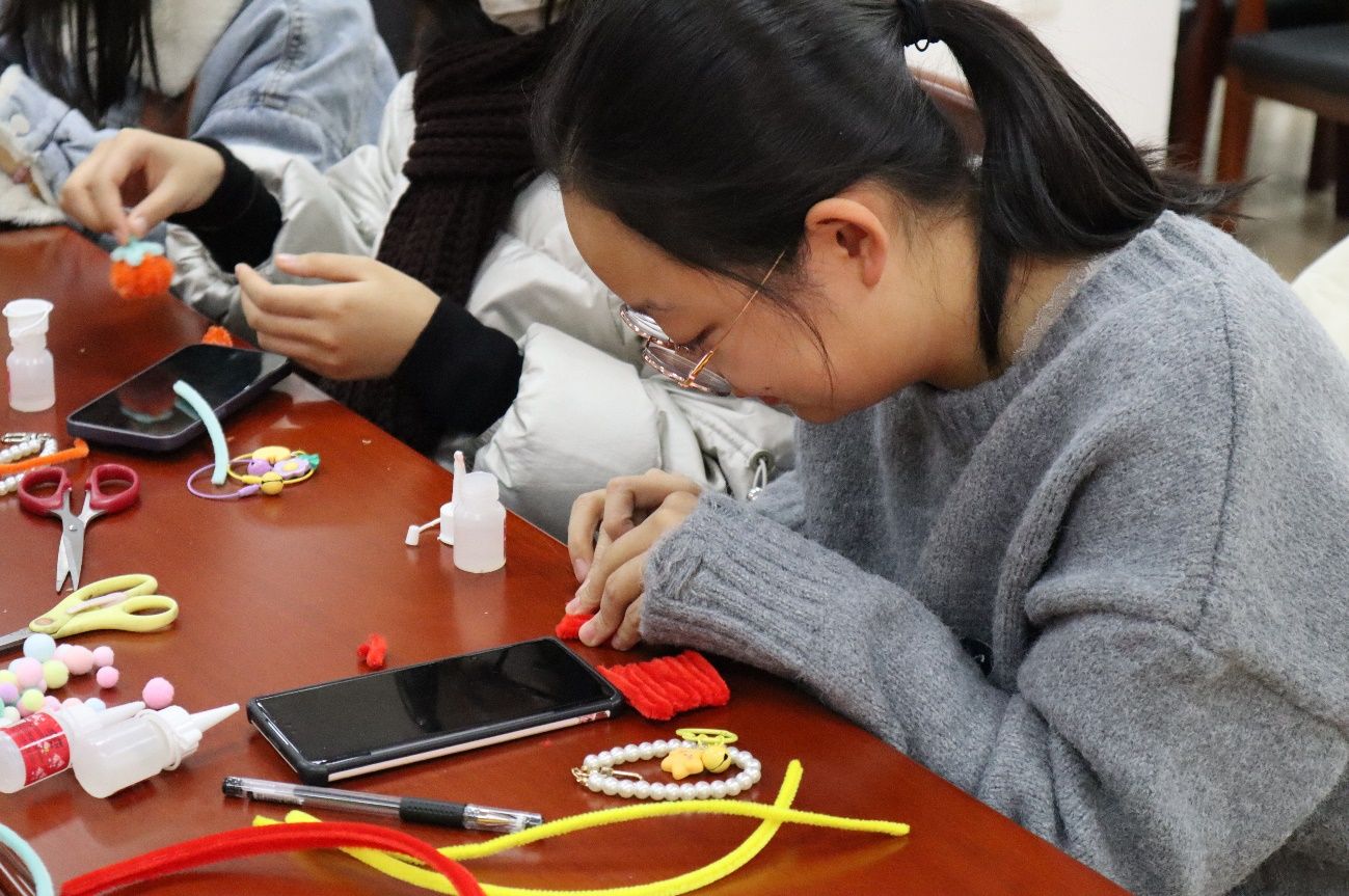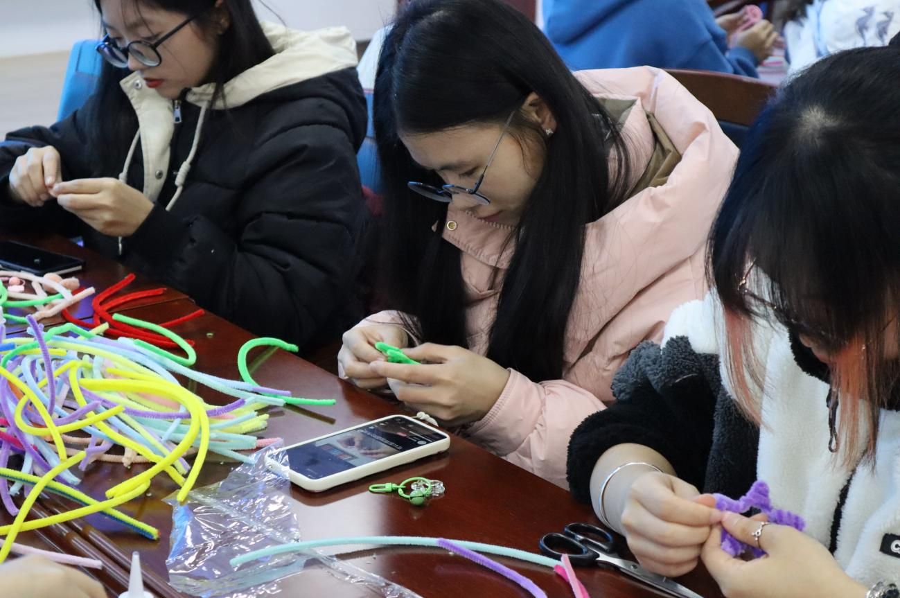 随后,志愿者们给参加活动的同学分发了手工制作所需的扭扭棒和胶水。同学们用手机观看教学视频,选择喜欢的扭扭棒挂件形状开始制作。同学们初时略显生疏,可很快发现其中的乐趣,掌握了制作的要领,逐渐沉浸在本次活动轻松愉悦的氛围中。