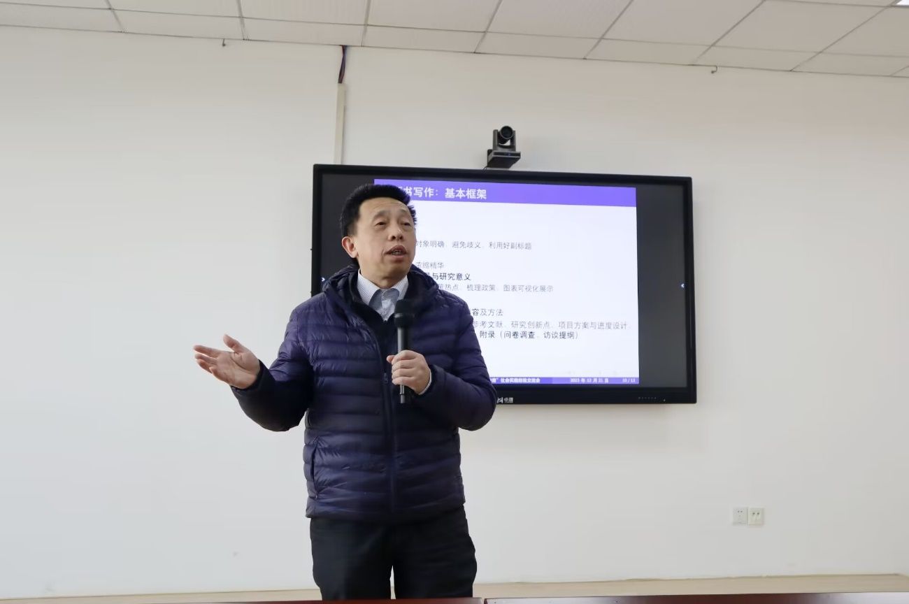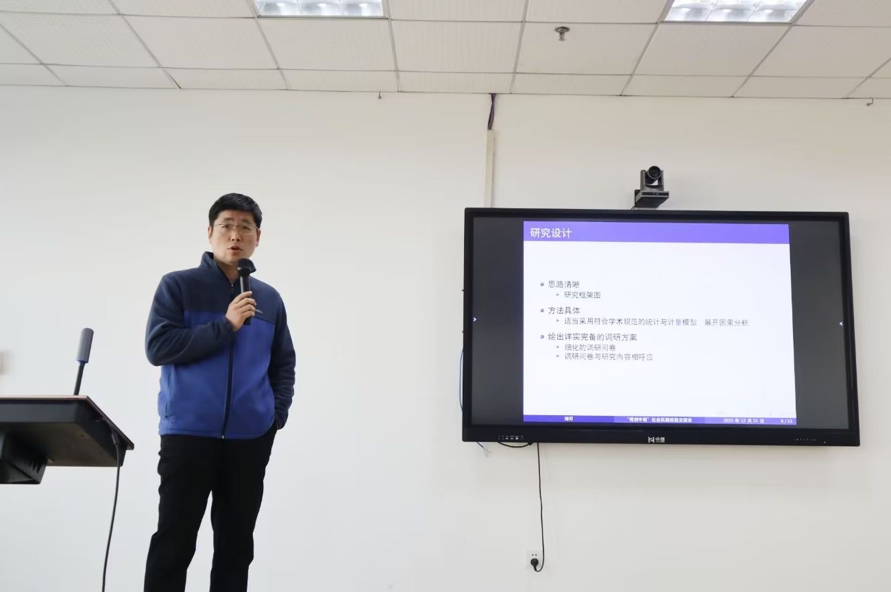 本次交流会首先由褚印副教授就创新比赛和社会实践的基本流程和方法对同学们进行指导。褚教授主要介绍了研究选题、研究设计、立项书写作、答辩四方面的内容。在选题方面,他强调了“顶天立地”原则的重要性和寻求导师指导的时效性;在设计方面,他说明了思路构思、方法运用、方案撰写的要求,介绍了两种设计的基本模式;随后,褚教授在立项书的写作技巧和框架上进行了说明和指导;最后,他就答辩的要求和流程进行了介绍。褚教授全面的为同学们说明了创新比赛和社会实践的基本信息,让同学们对大学期间的社会实践有了更加充分的了解。
