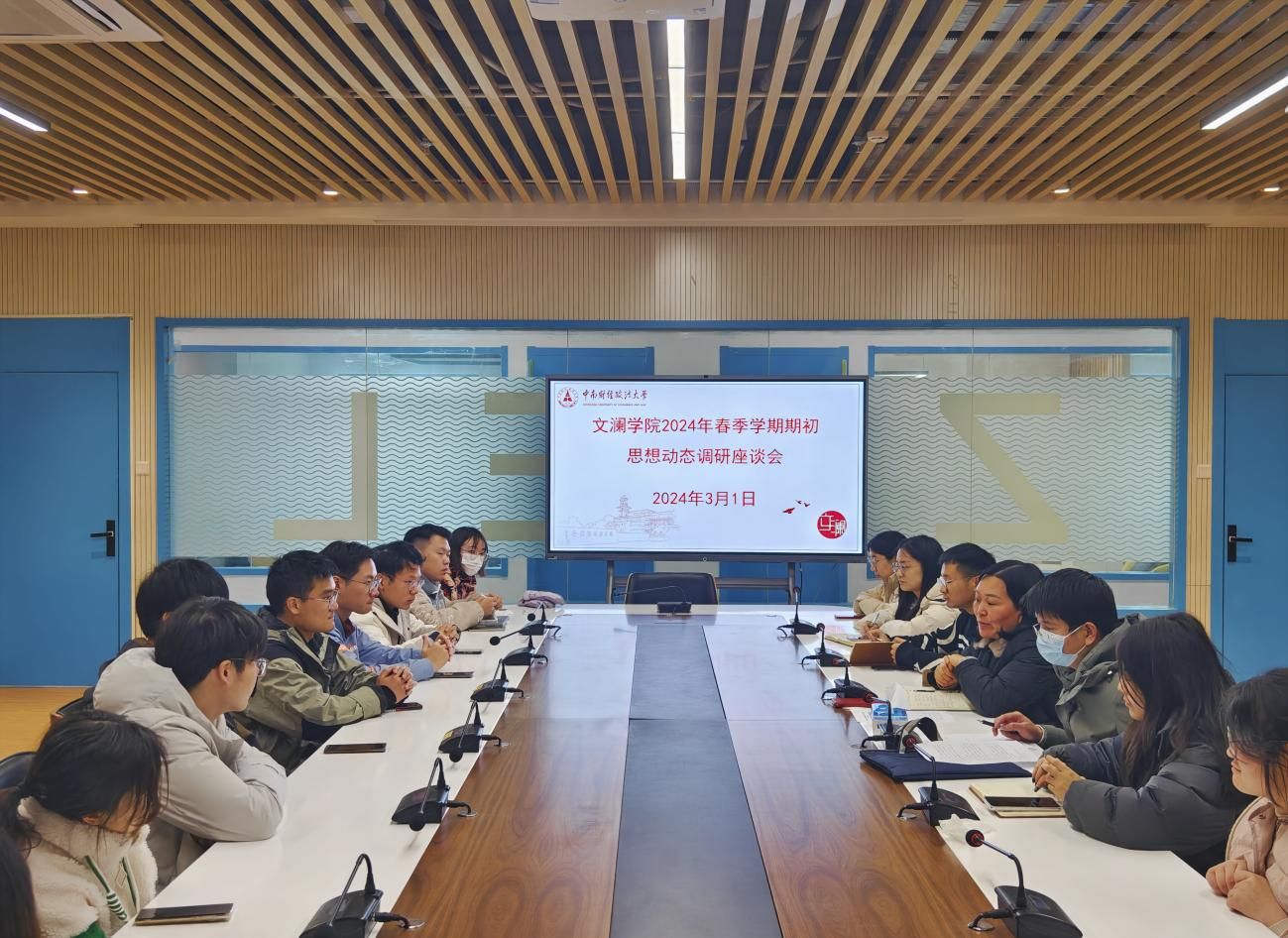 (通讯员/蔡臻真、戴士崴)为及时准确了解和掌握学生寒假返校的思想动态,针对学生的思想困惑和实际需求进行及时有效的排忧解难,以更加饱满的热情做好新学期学生工作,文澜学院于2024年3月1日中午在望湖一站式学生社区大学生素质教育中心1号会议室举办2024年春季学期初思想动态调研座谈会。会议由文澜学院党委书记彭晓燕同志主持,学院本科生、研究生辅导员以及各班主要班委代表、学生代表、党员代表参加本次座谈会。