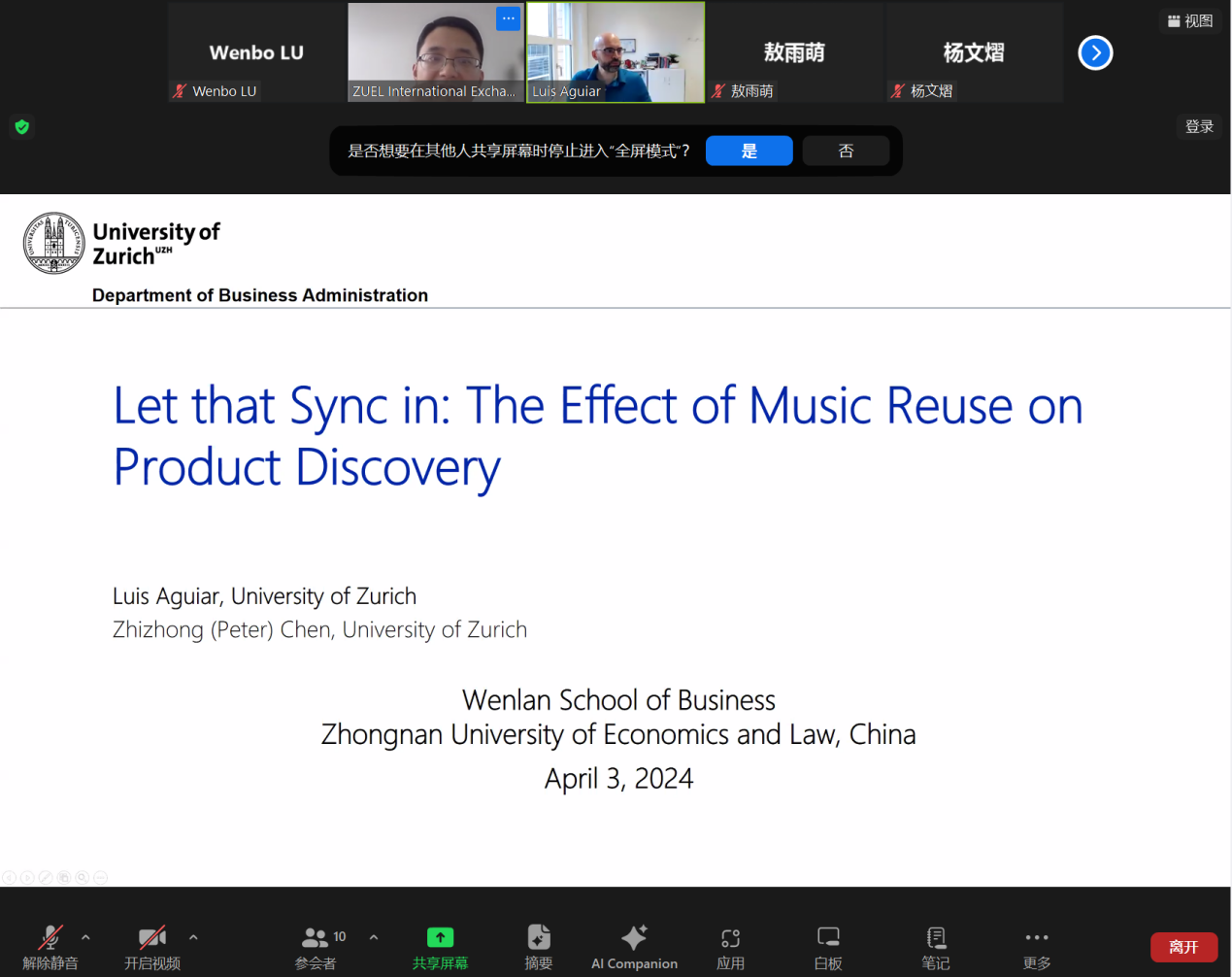 苏黎世大学工商管理系数字化转型管理与经济学副教授Luis Aguiar受邀为我院开展学术讲座,讲座主题为“Let that Sync in: The Effect of Music Reuse on Product Discovery”。本次讲座由帅杰老师主持,文澜学院众多师生听取了本次讲座。