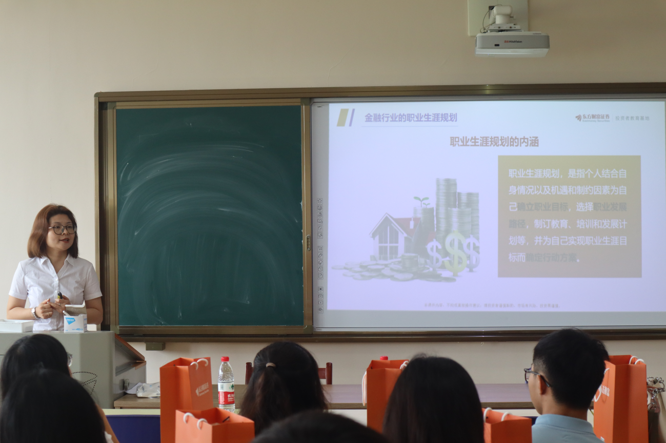 东方财富证券武汉中山大道证券营业部总经理何川女士,以“深入金融行业,完善职业规划”为主题,从职业生涯规划的内涵、流程等方面,与同学们分享了职业规划的方法和经验,并鼓励同学们积极参加由企业方主办的活动与竞赛,充分发掘自身潜能。