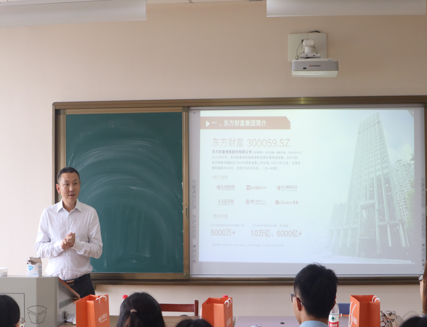 座谈会结束后,东方财富证券湖北分公司领导给同学们讲授了一堂职业生涯规划课。文澜学院学生工作办公室主任余利主持交流会。首先,东方财富证券湖北分公司袁立华总经理讲话。袁经理向同学们介绍了证券公司的组织架构以及东方财富的发展历程,强调了科技金融这一关键词,并简述自己对证券行业的认知,幽默风趣,言简意赅,让文澜学子受益匪浅。