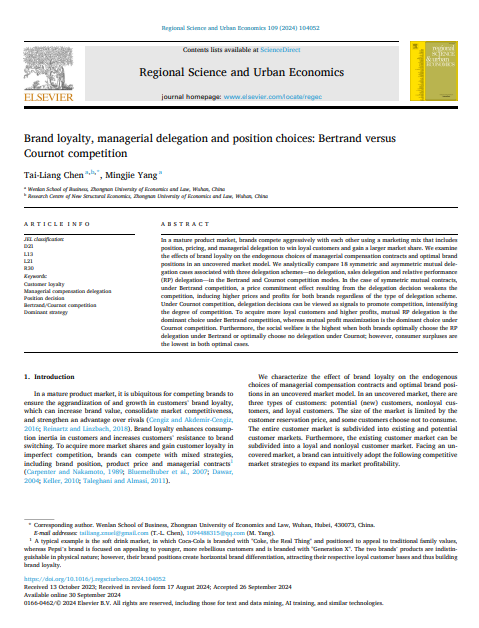 文澜学院2023级博士研究生杨茗杰与陈泰良教授共同完成的研究论文《Brand Loyalty, Managerial Delegation and Position Choices: Bertrand versus Cournot Competition》在国际权威区域经济学期刊《Regional Science and Urban Economics》上发表 (米兰电竞·(中国区)A-级期刊)。文澜学院坚持科研育人和实践育人的理念,旨在培养国际化、具有创新性、融通性的拔尖人才。学院从海内外聘请了大批优秀经济学博士及专家学者组建了文澜学院专职教师团队,积极为研究生搭建学术交流与科研实践平台,营造浓厚学术氛围。近年来文澜学院博士研究生取得的学术科研佳绩,进一步彰显了文澜学院科研人才培养模式的成效。
