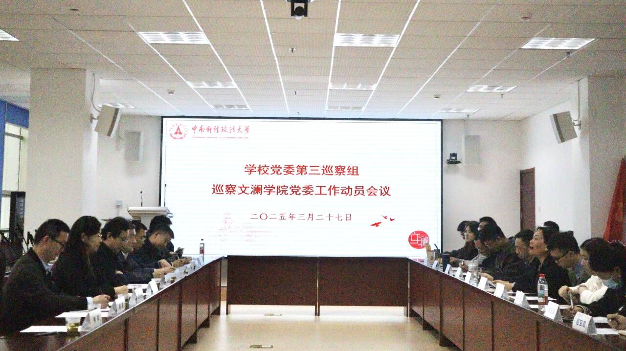根据学校党委巡察工作统一部署,2025年3月27日下午,校党委第二轮第三批巡察第三巡察组巡察文澜学院党委动员会员会议在文澴楼709会议室召开。校党委第三巡察组组长黄俊雄,校纪委副书记、校党委巡察办公室主任张文剑,校党委第三巡察组副组长向敏、张雅南,校党委巡察办公室副主任夏东伟,巡察组成员白高辉、杨晨、林昇,党委巡察办公室纪检员刘一民出席会议。文澜学院领导班子成员及学院全体教职工参加会议。会议由文澜学院党委书记彭晓燕主持。