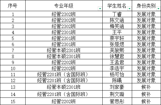 为了增强发展党员工作的透明度,接受党内外群众的监督,更好地保证发展党员的质量,根据《中国共产党章程》、《中国共产党发展党员工作细则(试行)》和我校《关于在发展党员工作中实行公示制度的意见》的有关规定,各党支部于2025年4月1日召开了支委会讨论新发展党员事宜。本次拟确定丁睿等15名同学为发展对象(含候补)。具体学生名单如下: