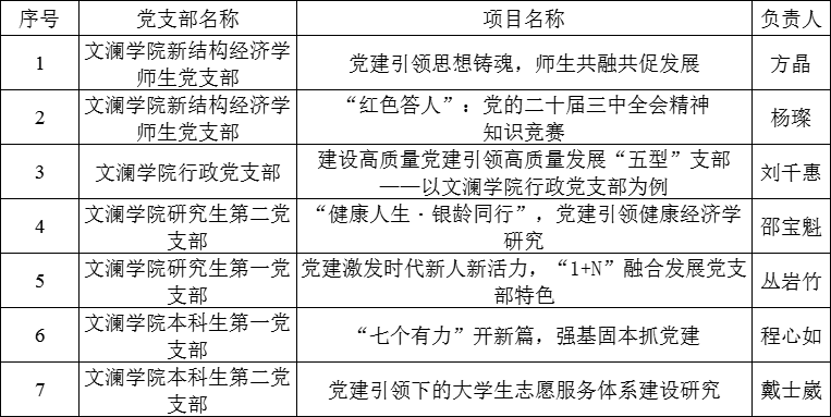 经学生自主申报、专家评议等环节,文澜学院党委2025学年党支部建设“揭榜挂帅”项目立项结果公布如下: