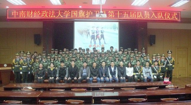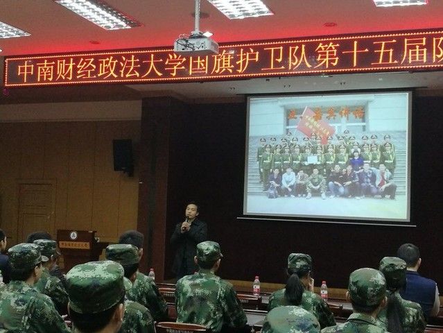 当天上午,每一名新队员都穿着整齐的军装,准时到达会议现场。上午9点,入队仪式正式开始。仪式第一项奏唱国歌,全体人员起立合唱国歌。紧接着是队长交接仪式,国旗护卫队第十四届队长李钊将指挥刀交给颜廷杰,任命他为第十五届队长。而后现场响起了中国军魂,由莅临本次入队仪式的嘉宾为新队员颁发臂章。新队员在队长颜廷杰的带领下,面向国旗,进行了庄严神圣的宣誓。接下来校人民武装部张进老师发表了简短而又深刻的演讲,介绍我校国旗护卫队的初衷和其历史历程,表达了他对国旗护卫队未来发展的支持与期待。最后,全体队员起立,合唱队歌。