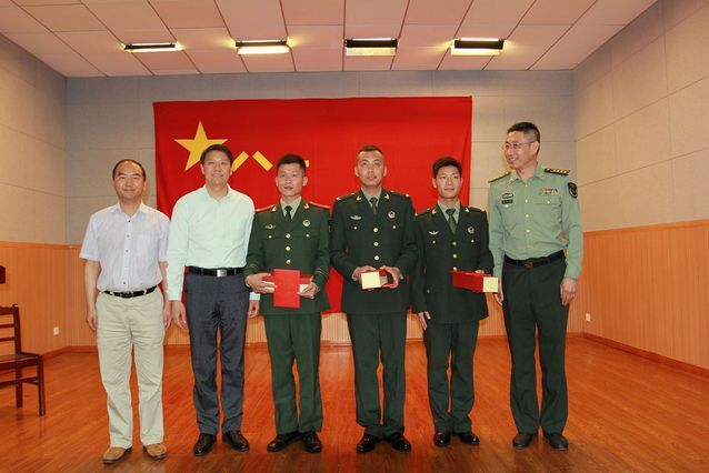 冉玉祥大校、王文贵书记、朱虹部长为优秀退役大学生颁发荣誉证书。
