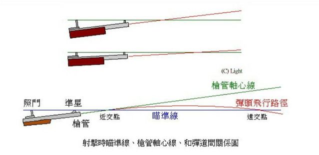 机械瞄具的目的用于辅助远射兵器射击。毕竟地球是有引力的,兵器发射的抛射体是按抛物线飞行的,而瞄准线却是直线,机械瞄具提供的瞄准点(POA)是为弹着点(POI)的参考,在一定距离上瞄准点与弹着点一致时,我们说这支武器已经校准好了。