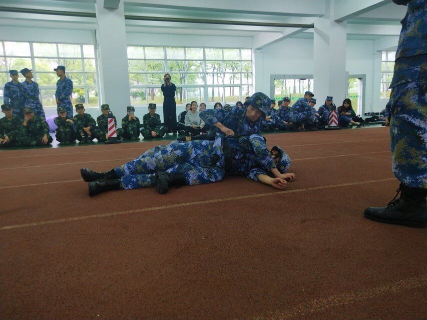 接着是由海军工程大学蛟龙特战队16和17级学员进行战术表演,他们先是以小队形式模拟在战场上前进,在极度紧绷状态下各位置的队员按战术负责瞄准不同方位、并按指令立即作出反应,经过他们长期的专业训练早已建立起对该技术动作的条件反射。及后有单兵战斗基础动作演示及详细讲解,例如是在执枪的基础上进行“卧倒”、“起立”、“低姿、,高姿、侧身匍匐前进”,海军工程大学蛟龙特战队队员还为我校学员准备了实战装备进行体验,让我们体会到背负具有一定重量的装备做出标准动作的难度。此外,海军工程大学蛟龙特战队还派出了两名学员进行了近战格斗的对战示范表演以及动作讲解,一上场就“实打实摔”、“拳拳到肉”,充分展示格斗动作的,场面令人血脉偾张。