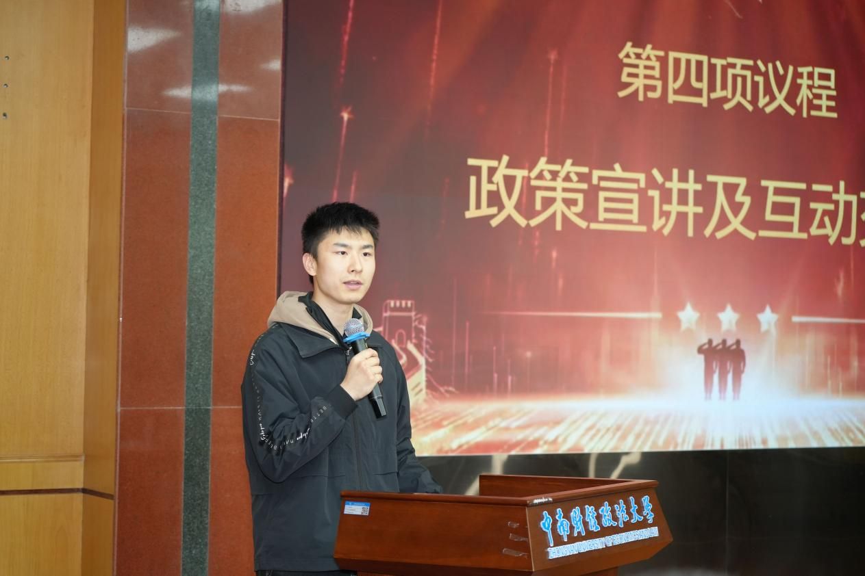 大会第四项,退役大学生、士兵之家代表李俊霖详细解读最新征兵政策,涵盖报名条件、报名流程、国家政策优惠和学校福利等,并对老师和同学们的提问一一进行解答。