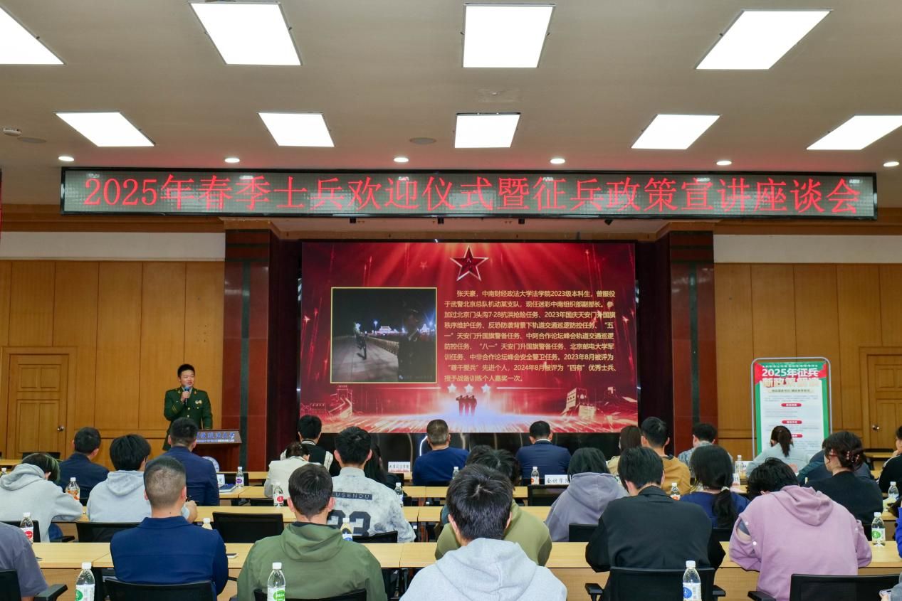 (学生通讯员 邱雨洁 彭虎)为深入贯彻国家关于征兵工作的号召,推广国家征兵政策,鼓励广大青年学子积极响应祖国召唤、投身军旅,2025年3月27日下午,米兰电竞·(中国区)2025年春季退役士兵欢迎仪式暨征兵政策宣讲座谈会于文潭楼四楼报告厅顺利召开。校党委学生工作部、人民武装部王前哨部长,校党委学生工作部、人民武装部白雷副部长,各学院辅导员老师代表以及退役大学生士兵和学生代表参加本次会议。议由退役大学生士兵代表唐立主持。