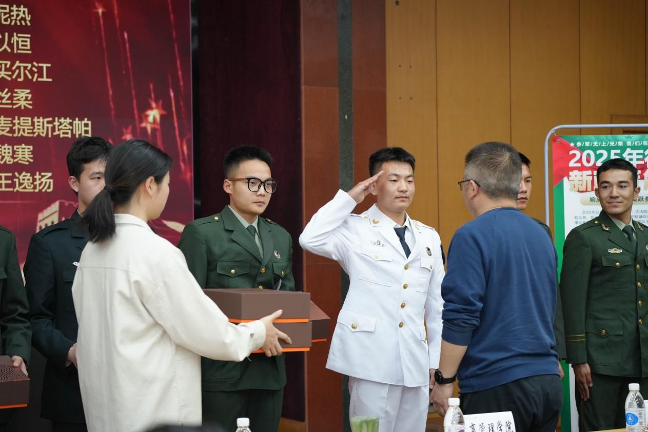 大会第二项,白雷宣读2025年3月退役大学生名单。王前哨为退役学生代表颁发纪念品。
