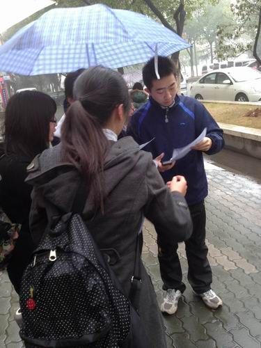 三月十五号虽然下起小雨,但却丝毫没有动摇大家志愿者活动的决心。信管1001班同学分成三支分队。细密雨丝中,同学们开始发放传单,并耐心讲解传单内容。活动传单由班级同学精心设计,对于如何保养笔记本、如何解决使用笔记本过程中可能出现的问题作了详细说明,并介绍了一些常用软件的使用技巧,以帮助同学们解决一些生活中的电脑小问题。接受传单的同学或驻足凝听,或微笑致谢。此外,信管1001班的班级人人和班级博客上也贴出相关文章,介绍电脑知识,供大家参阅。