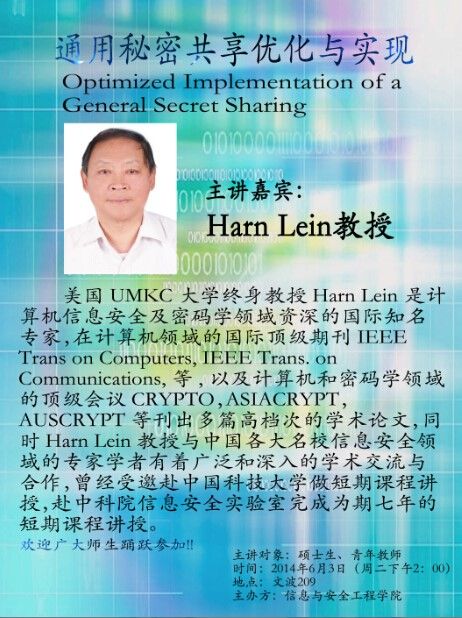 2014年6月3日下午2点,我院有幸邀请到来自美国UMKC大学的终身教授Harn Lein在文波楼209教室作名为《通用秘密共享优化与实现》的专题讲座。来自我校的青年教师以及硕士生参加了本次讲座。整个讲座持续了4个小时,听众人数达到120人,现场气氛热烈,无论是Harn Lein教授独到的见解还是我院硕士生的积极提问都令人印象深刻。