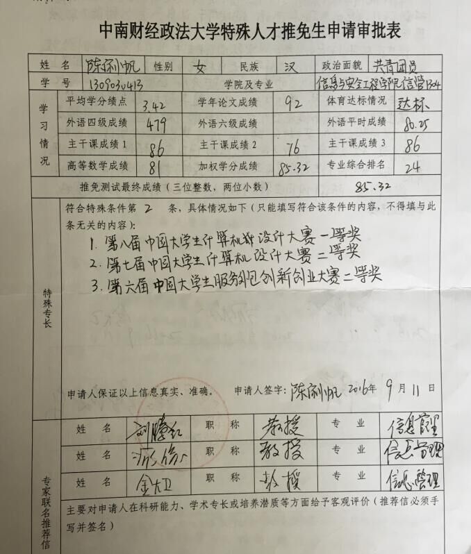 陈俐帆、1309030413、信息管理与信息系统专业,符合特殊条件第2条。