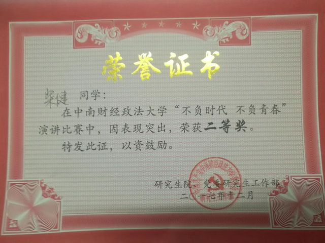 2017年12月18日,全校研究生“不负时代,不负青春”主题演讲比赛决赛于文泰楼模拟法庭(二)顺利开赛,校党委书记栾永玉,党委副书记王文贵,校相关职能部门负责人出席了本次比赛。比赛由党委研究生工作部周佳玲部长主持。院党委张从发书记和研究生辅导员付慧娟老师到现场观看了本次演讲, 2017级硕士研究生柴健代表学院参加比赛。