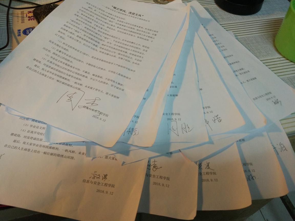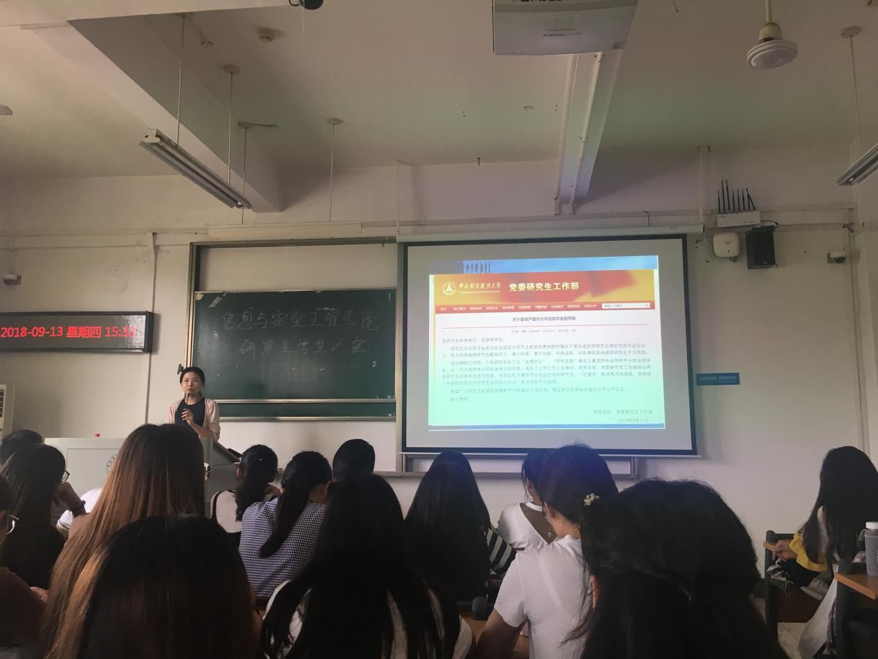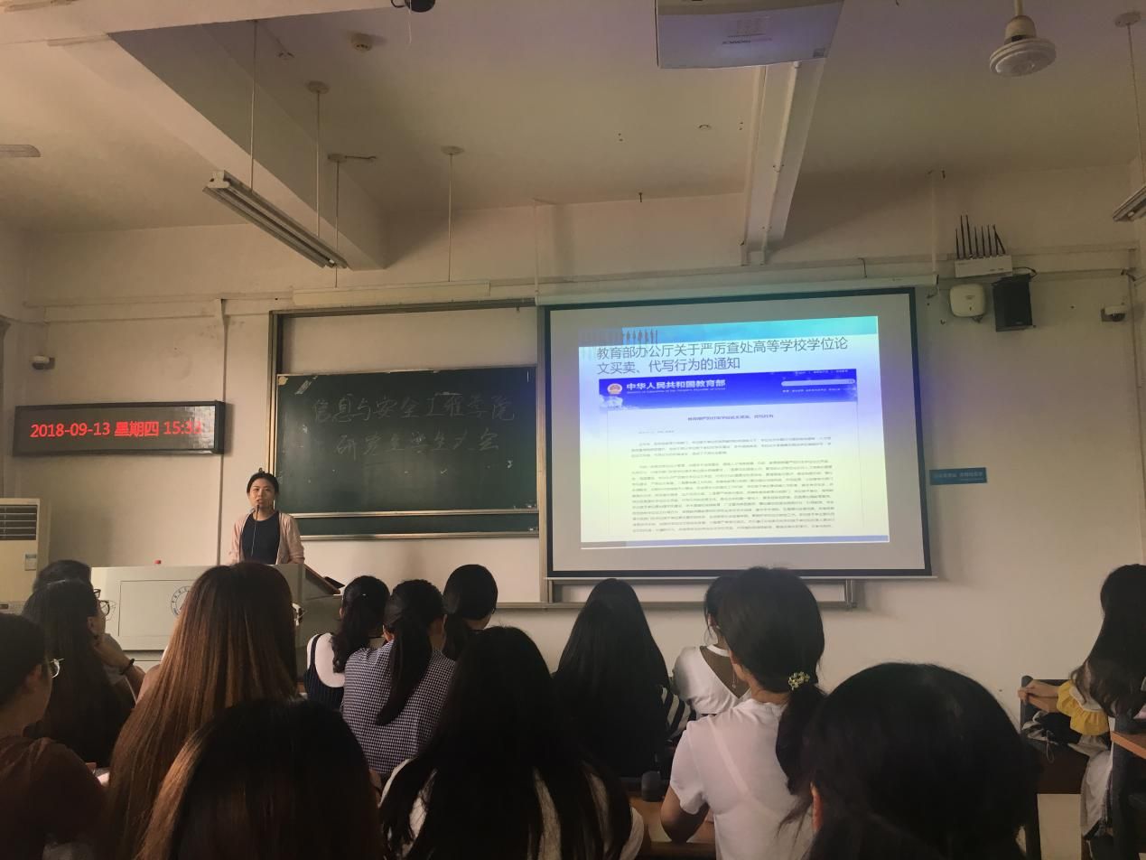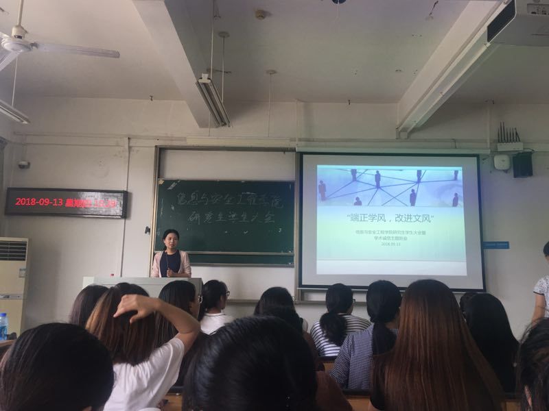 (通讯员:杨茗 金丹丹) 为端正学风,改进文风,9月13日下午15:30,信息与安全工程学院全体研究生学生大会暨学术诚信主题班会在文添楼203教室顺利召开。学院三个年级研究生197人参加了此次班会。班会由研究生辅导员付慧娟老师主持。