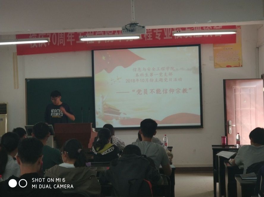 2018年10月11日星期四下午两点半,信息与安全工程学院本科生第一党支部在文永502教室开展了以“党员不能信仰宗教”为主题的党日活动。