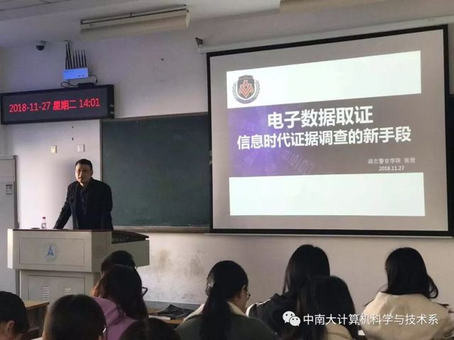 2018年11月27日,我系邀请湖北警官学院张俊副教授到我校参加信息安全本科专业建设研讨,并为师生们做了题为“电子数据取证--信息时代证据调查的新手段”的学术报告。
