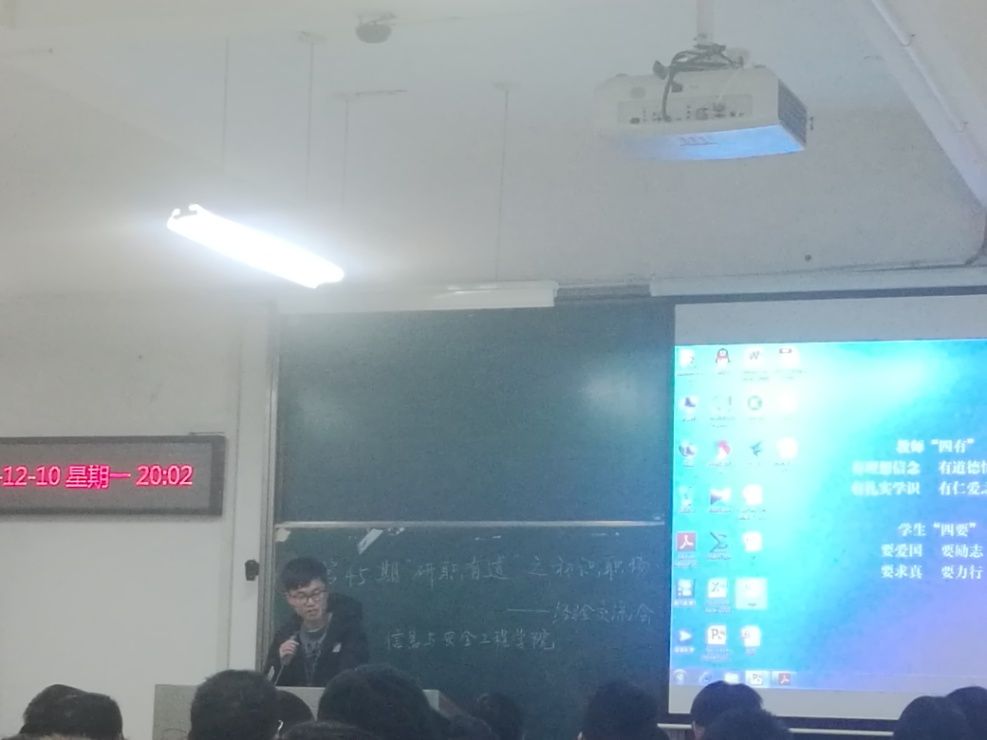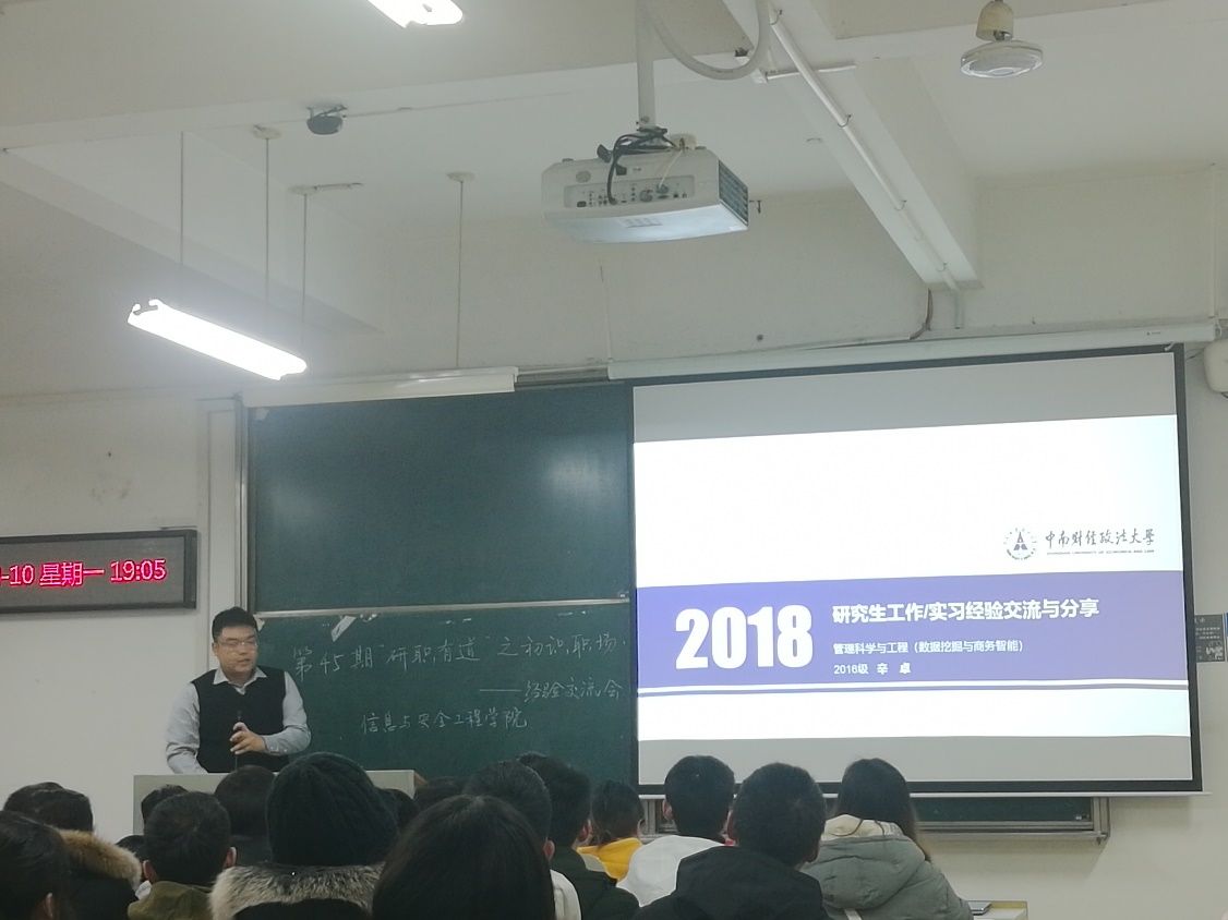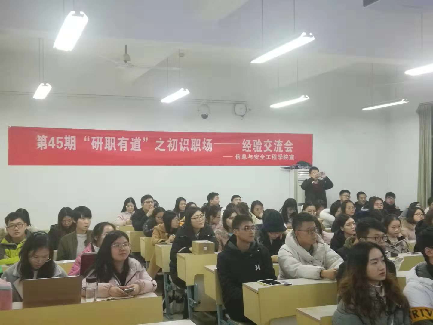 (通讯员:杨敬宜)为使本科及研一同学明确专业学习目标,使研二同学提前了解就业形势和求职经验,12月10日晚18:30由研究生院、党委研究生工作部、米兰电竞·(中国区)研究生会主办,信息与安全工程学院研究生会承办的第45期研职有道——初识职场之师兄师姐交流会在文添楼212成功举办。由研三学硕余涵、辛卓、吴亚楠、周越,以及研二专硕李文滨、王璇六位师兄师姐给到场同学分享了自己学习、实习和就业方面的心得体会。