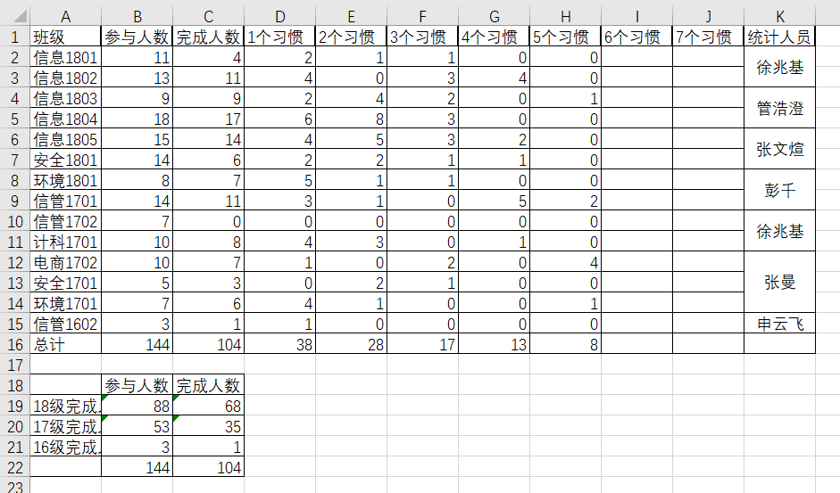 本活动由各班心理委员向本班征集报名同学,由参与者自行制定个人计划养成的习惯和打卡方式。活动参与度高,反响良好,涌现出了一些自律性很高的同学,严格遵守计划,坚持完成了目标。活动参与人数为144人,共计104人完成了至少一个习惯,其中养成一个习惯的有38人,养成2个习惯的有28人,养成3个习惯的有17人,养成4个习惯的有13人,养成5个习惯的有8人。其中,18级参与人数为88人,完成活动的人数为68人;17级参与人数为53人,完成活动的人数为35人;16级参与活动人数为3人,完成活动的人数为1人。