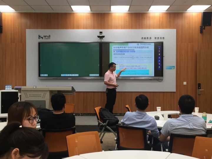 宗教授着重向大家介绍了针对复杂通信环境中多智能体系统容易遭受如通信延迟、测量噪声和切换拓扑等不确定性问题,如何基于概率论和统计稳定性理论来设计多智能体系统的协同控制器的最新研究成果。对于在座师生提出的诸如大雁南飞、鱼群合围等实际问题,宗教授也用诙谐幽默的方式与大家展开了广泛的交流。