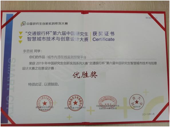 在我院教师杜建华、陈子鹏带领下,胡美娟、李思娴、刘冉同学精心构思、策划并递交了作品“城市内涝在线监测预警平台”。我院研究生团队和来自全国各高校的九百多件作品中角逐,脱颖而出成功进入决赛。在决赛现场,经过展示、答辩等环节,作品得到评委老师的认可,最终获得全国优胜奖的优异成绩。