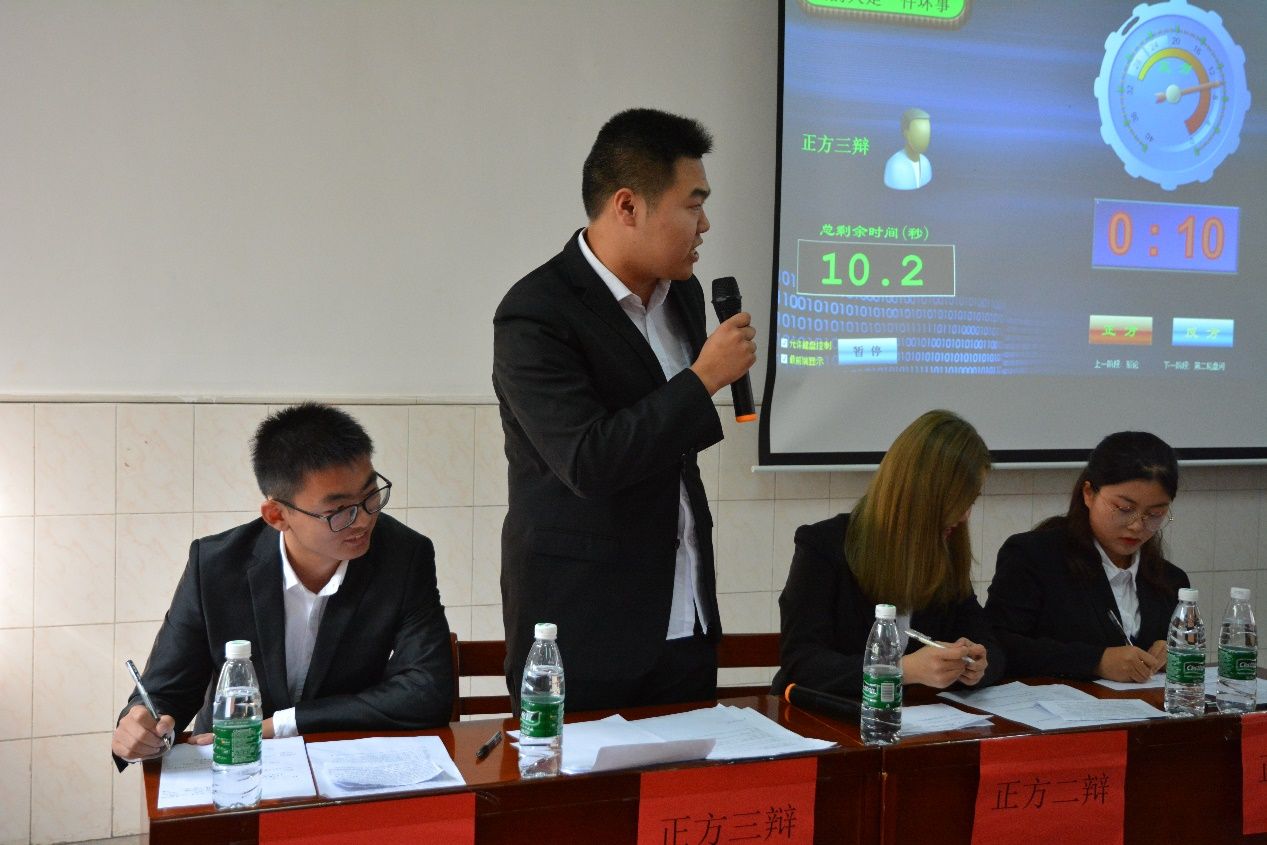 首先由主持人向19级新生介绍辩手职能和赛制,并确定此次辩论的六个环节——立论,驳论,盘问,盘问小结,自由辩论和总结陈词。随后双方选手自我介绍,正方选手的立论标志着着此次辩论表演赛正式开始。赛场气氛自此紧张起来,双方辩手唇枪舌战,用缜密的思维捕捉对方语言的漏洞。在一次又一次的辩驳中,辩论赛的气氛逐渐走向白热化,随着自由辩论环节的到来,赛场仿佛化为没有硝烟的战场,双方辩手金句频出,更是博得场下同学的阵阵喝彩。