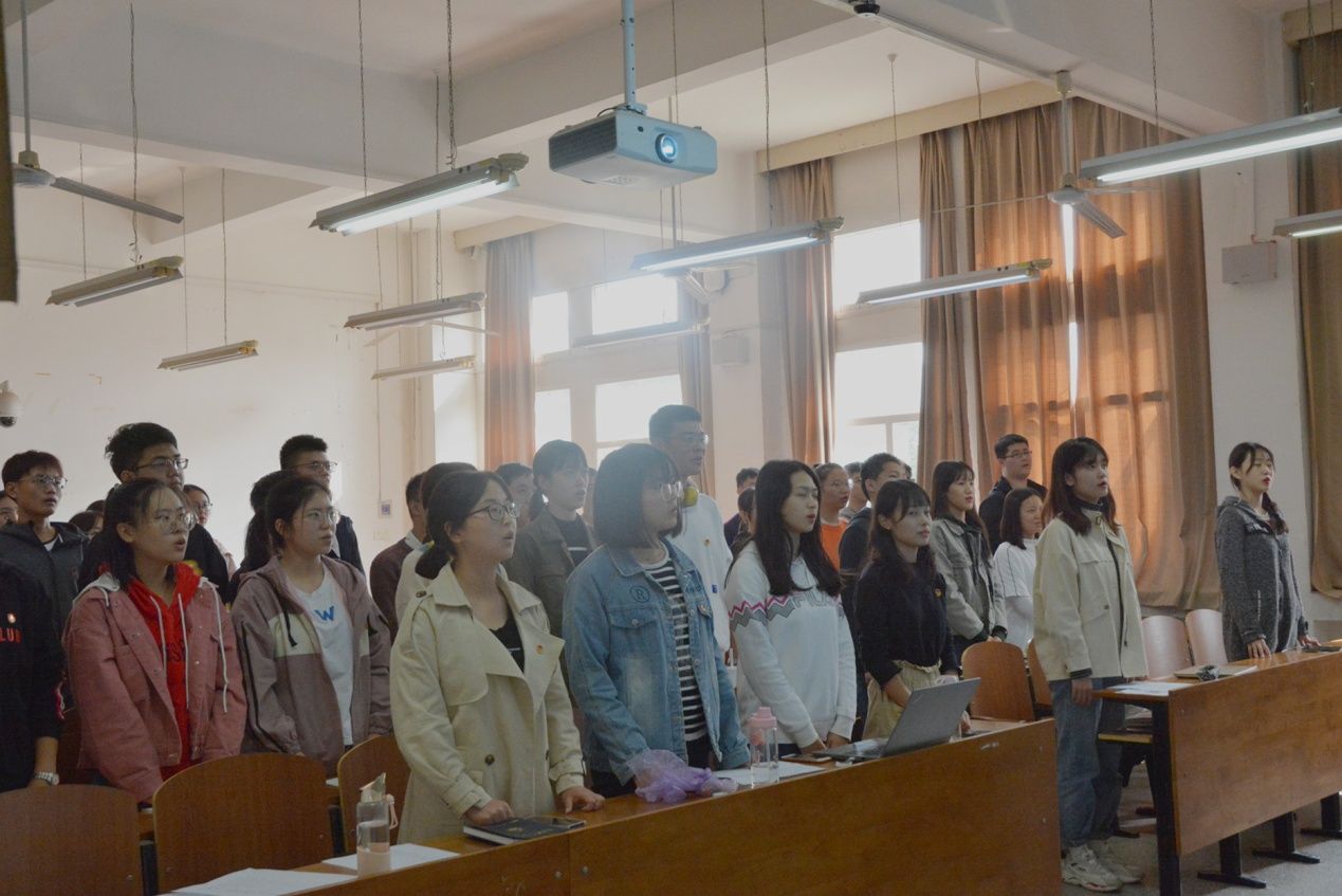 会议伊始,由主持人秦天昌介绍会议要求,宣布全体起立,奏唱团歌。随后,组织部部长党文娟带领全体成员重温入团誓词。在座的每位同学都昂首挺胸、精神抖擞,激昂的歌声和誓词在教室中回荡,尽显工程学子的风采。