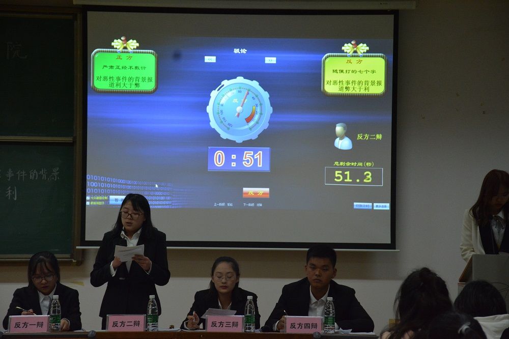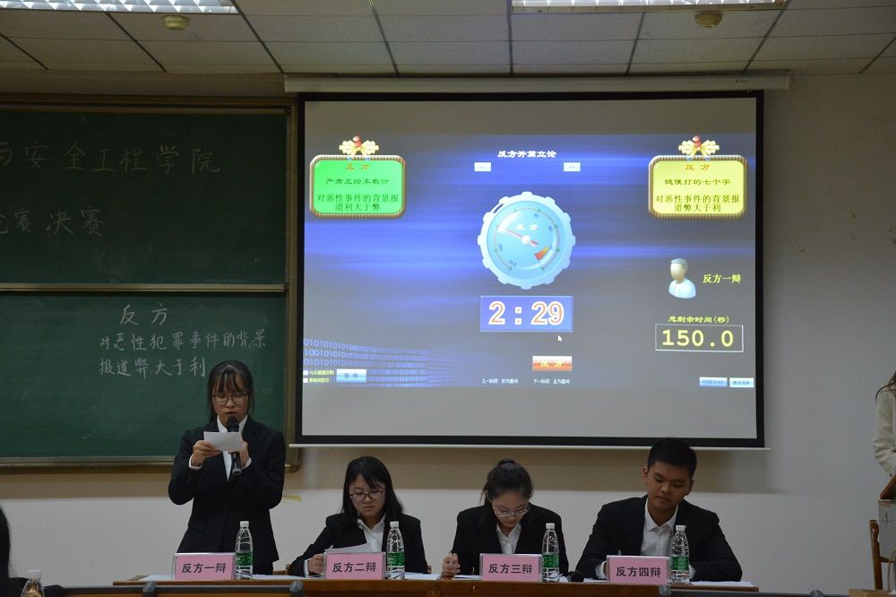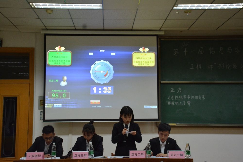 信息与安全工程学院辩论队创建于2008年。立足于扎实辩论基础,秉持“以文载道,锋锐不羁”的理念不断开拓创新。活动伊始,主持人介绍了本次辩论赛主题的相关背景和比赛流程,接着主持人介绍了正方队伍和反方队伍:正方是由一辩卓智辉,二辩张杰妮,三辩李雨洁,四辩符永义组成的“严肃正经不敷衍”队;反方队伍是由一辩叶鸥,二辩施艳萍,三辩刘洋,四辩巨天宇组成的“随便打的七个字”队。队伍介绍完毕,精彩的比赛拉开了帷幕。