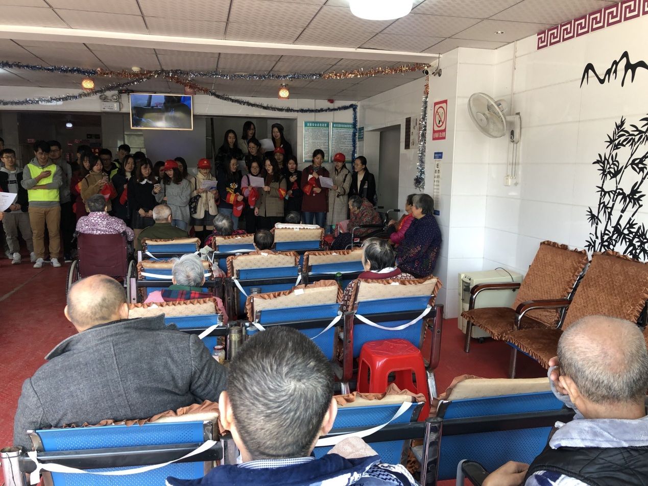 接下来进入到志愿服务活动的最后一项,志愿者们来到洪山区城市花园社区养老院开展敬老、助老活动。志愿者们为老人演唱了《我和我的祖国》、《没有共产党就没有新中国》、《让我们荡起双桨》等耳熟能详的歌曲,台下的老人深受感触,也跟随着旋律一起哼唱。随后,志愿者们在院长的带领下来到各个楼层的房间,陪老人拉家常、听老人讲过去的故事,在给老人带来温暖的同时自己也收获了满满的感动。志愿服务的时间很快过去,志愿者们同老人一一告别,老人对志愿者们的志愿服务给与了很高的评价,并邀请大家再次到来。