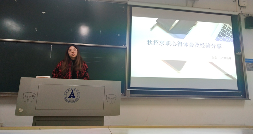 主持人主持开场之后,已签约腾讯(深圳)科技有限公司商务拓展管培生的马洪舟、中移在线服务有限公司需求分析师的刘志聪、招商银行武汉分行定向培养生(Fintech)方向的金岳、阿里巴巴网络科技有限公司算法岗的金雅琴、北京快手科技有限公司前端开发工程师的阮叶丽、阿里巴巴本地生活事业部高级Java开发工程师的何世亮和阿里巴巴本地生活事业部高级Java开发工程师王镇浩七位嘉宾依次上台向大家讲述了他们在学习、实习和求职过程中的经历,总结出自己的一系列经验方法进行分享。