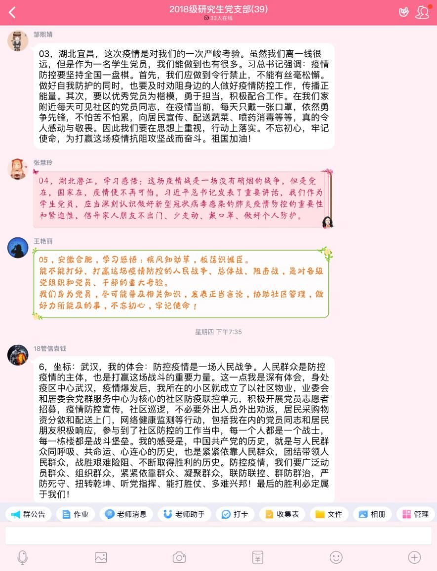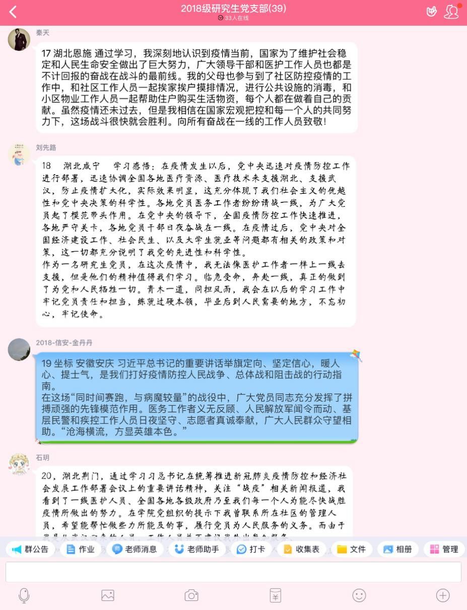 晚上七点半,2018级全体研究生支部党员同志在“2018级研究生党支部”QQ群中打卡签到。在金丹丹同志的主持下,各位党员同志依次发表自主学习《习近平总书记关于疫情防控重要讲话和指示批示精神》的心得体会。首先,同志们分别介绍了家乡疫情防治情况及所在社区采取的措施,如对社区进行封闭式管理,开展疫情排查、实行交通管制等并取得了一定成效,部分地市已经开始逐步推进复工复产工作。疫情的严重性给防疫防控工作带来了巨大的考验,但在党的领导下,习近平总书记亦时刻关注疫情形势,亲自指挥部署,全国的防疫工作已取得阶段性胜利。