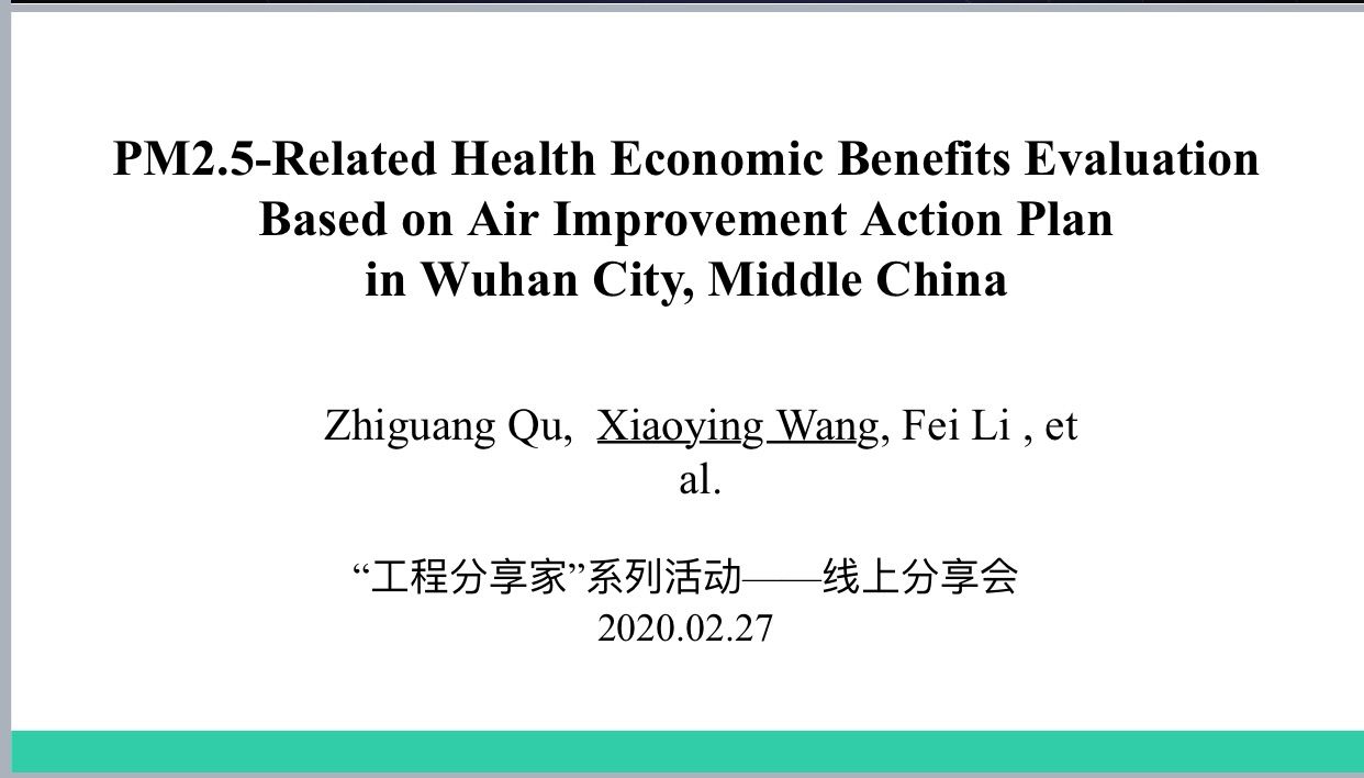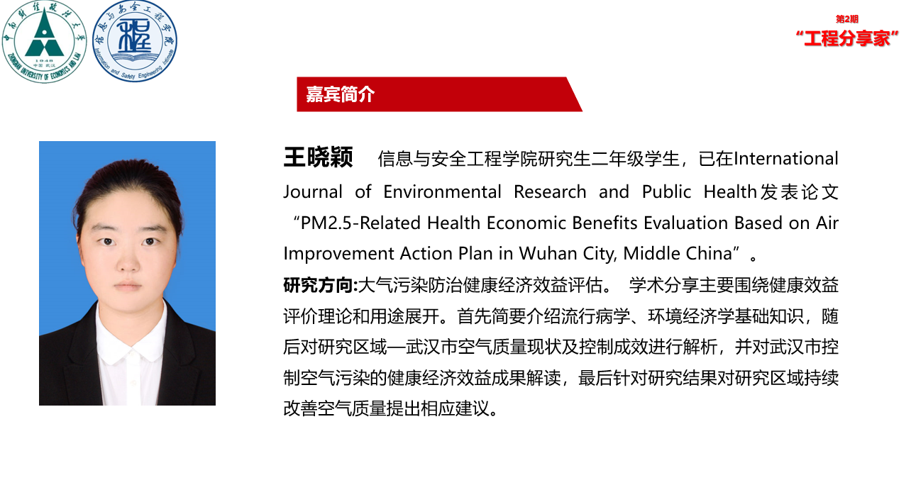 本次活动邀请的主讲嘉宾是信息与安全工程学院管理科学与工程专业二年级研究生王晓颖同学,已在International Journal of Environmental Research and Public Health发表论文“PM2.5-Related Health Economic Benefits Evaluation Based on Air Improvement Action Plan in Wuhan City, Middle China”。研究方向为大气污染防治健康经济效益评估。