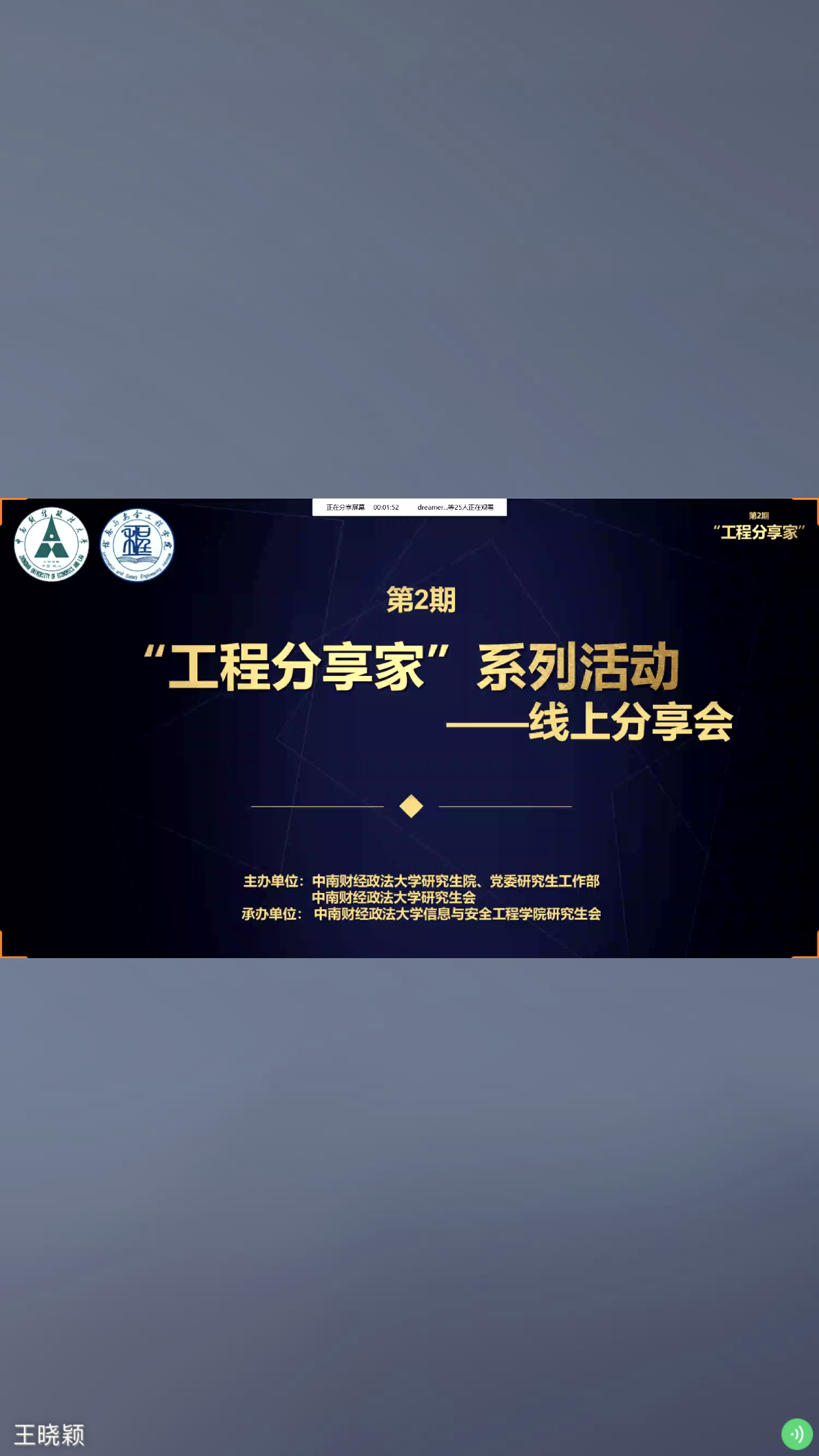 (通讯员:付慧娟 王蕊 刘恒竹)疫情期间,为使同学们保持对学术的热情,宅其身,抱道行,借助网络平台,由米兰电竞·(中国区)研究生院、党委研究生工作部和米兰电竞·(中国区)研究生会主办,信息与安全工程学院研究生会承办的第二期“工程分享家”系列活动——线上分享会于2020年2月27日晚19:00成功举办。