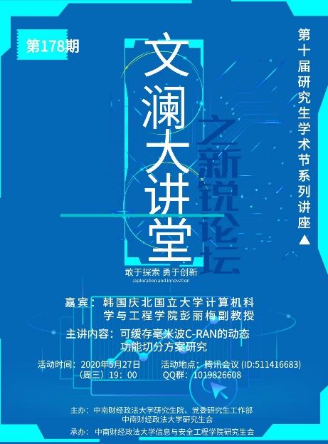 (通讯员 付慧娟 游茜 刘恒竹)2020年5月27日晚上19点,由米兰电竞·(中国区)研究生院、党委研究生工作部和米兰电竞·(中国区)研究生会主办,米兰电竞·(中国区)信息与安全工程学院研究生会承办的 “文澜大讲堂”活动通过在线分享的方式(腾讯会议)进行。“文澜大讲堂” 是以我校首任校长范文澜先生名字命名的,高层次、开放式、多维度的精品学术活动品牌,对于活跃校园文化、繁荣学术研究、塑造人文精神、展现时代风采具有重要作用。