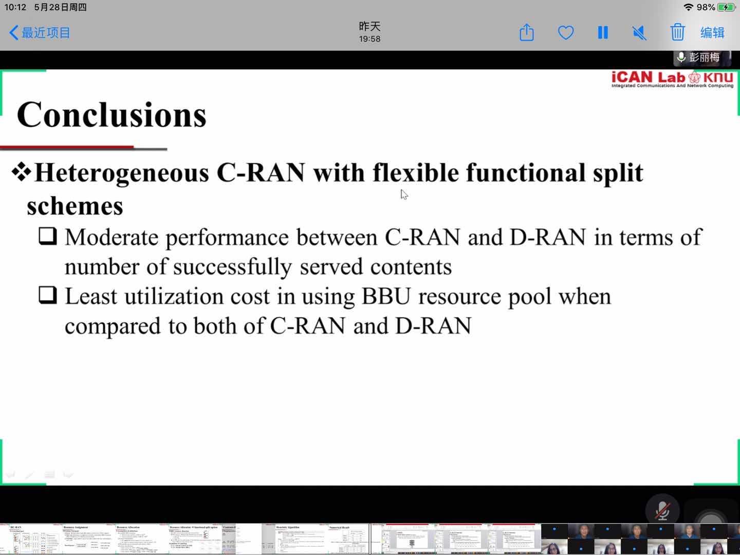 本次主讲我们邀请到的是庆北国立大学的彭丽梅副教授,主持人是张引副教授,主讲内容是可缓存毫米波C-RAN的动态功能切分方案研究。在传统C-RAN结构中,接入网功能可被划分为数个不同的功能模块,其中射频功能模块置于射频拉远头(Remote Radio Head, RRH)端,而基带处理功能模块集中置于基带单元(Baseband Unit, BBU)资源池,以简化RRH的功能降低其设备费用并对资源进行集中且高效的管理。但同时由于RRH与BBU间的前传带宽需求较大,导致传输资源与成本的浪费。为了解决这一问题,3GPP基于网络功能分割提出了多种静态或动态的网络切分方式。动态的功能切分策略允许C-RAN灵活选择合适的功能切分方式来服务不同需求的内容访问请求,以达到带宽需求与网络资源使用花费之间的平衡。