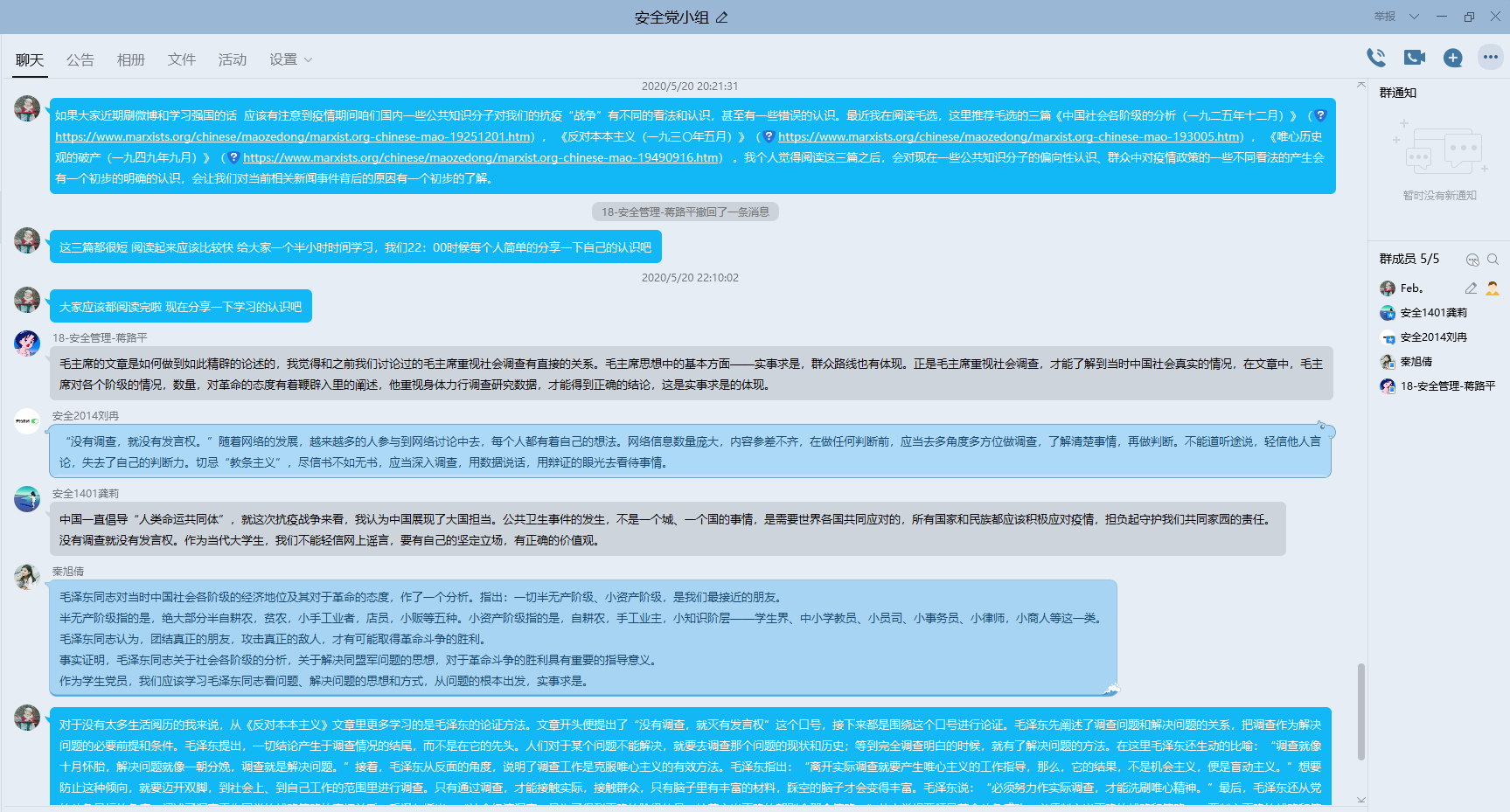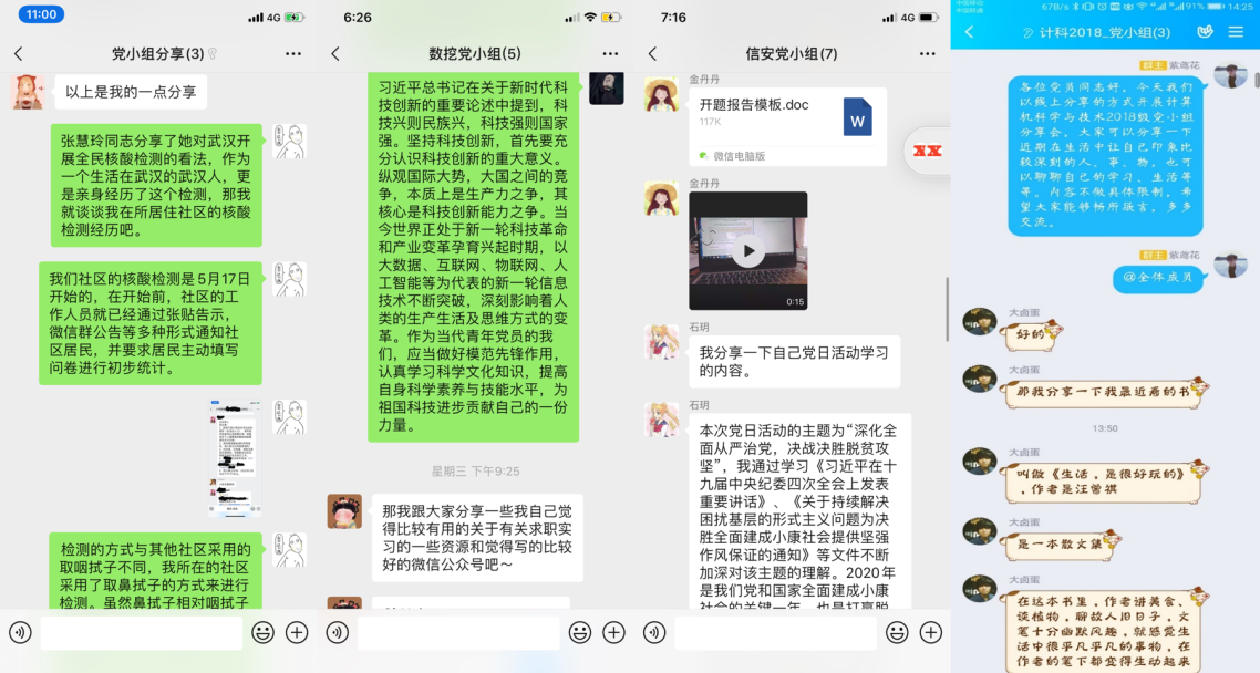 会议第三项,各党小组组长分别对小组内自主讨论分享会进行总结发言。大家围绕近日新闻热点及相关国家政策展开讨论,如管信党小组分享了武汉市开展全员核酸筛查的相关政策及感受,数挖党小组针对近期华为事件和习近平总书记关于科技创新的重要讲话精神进行讨论;与此同时,安全管理党小组的同志们学习了《反对本本主义》并与此次抗疫战争相结合阐述了各自的心得体会。此外,也有部分同志与大家分享了实习就业的经验、学习资料以及好书推荐等。尽管新冠肺炎疫情对大家的生活节奏和学习规划产生了一定的影响,但每一位党员同志都没有荒废时间,在关注疫情防控、复工复产等时事的同时,也在认真学习理论知识,积极准备实习求职及推进科研工作。