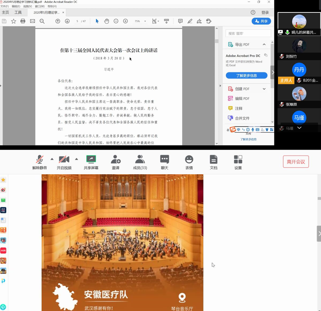 会议最后一项,由支部书记付慧娟老师对本次党日活动进行总结。首先,付老师带领大家回顾习近平总书记在第十三届全国人民代表大会第一次会议上的讲话,我国疫情防控的逐渐好转映照了习近平总书记“中国人民是具有伟大团结精神的人民”的观点;随后,付老师向大家分享了武汉市文化和旅游局赠予各省医疗队海报的背景故事:每张海报都将武汉和医疗队所在地的地域特色融合在一起,向疫情期间支援武汉的各地医疗队表示感谢。透过海报,大家纷纷感受到文化语言的魅力和祖国一家亲的浓厚情谊。付老师指出,青年是祖国的未来、民族的希望,也是我们党的未来和希望,习近平总书记在回信中提出的“让青春在党和人民最需要的地方绽放绚丽之花”,更是充满了对青年一代的期望与勉励。2020年是十三五规划的收官之年,而疫情的突发成为这场脱贫攻坚战的加试题,作为青年党员我们应当结合当下,思考如何更好地为建设祖国贡献自己的力量。