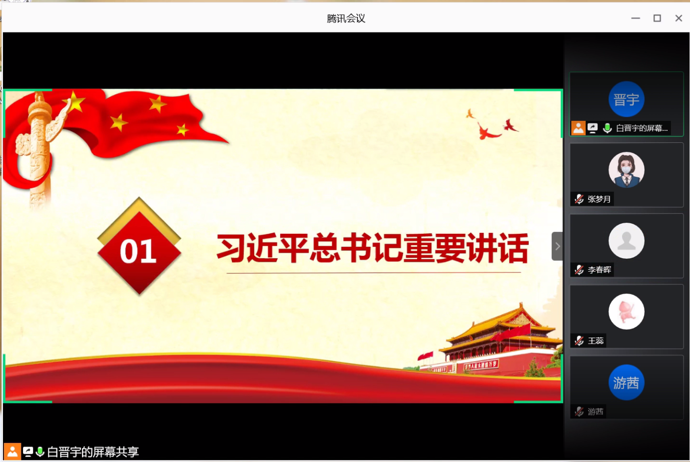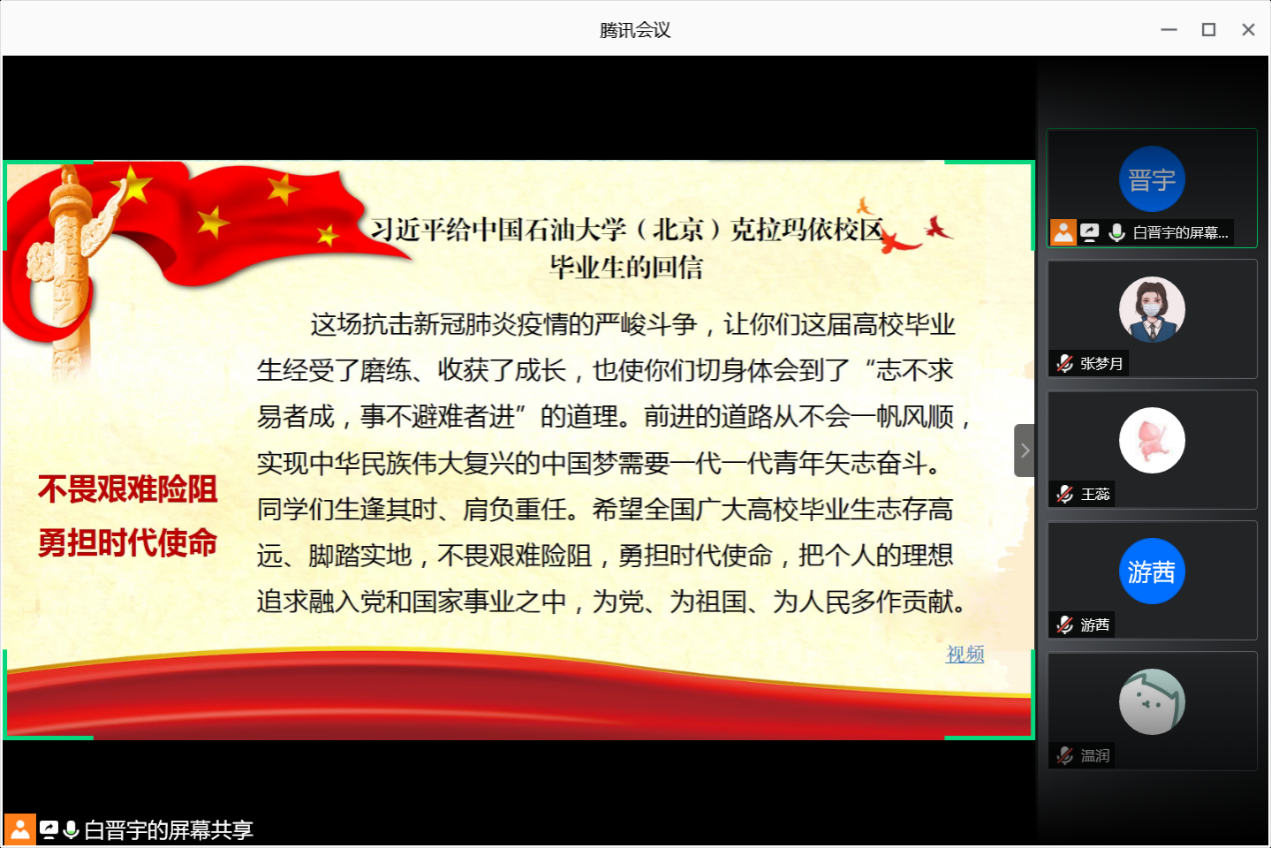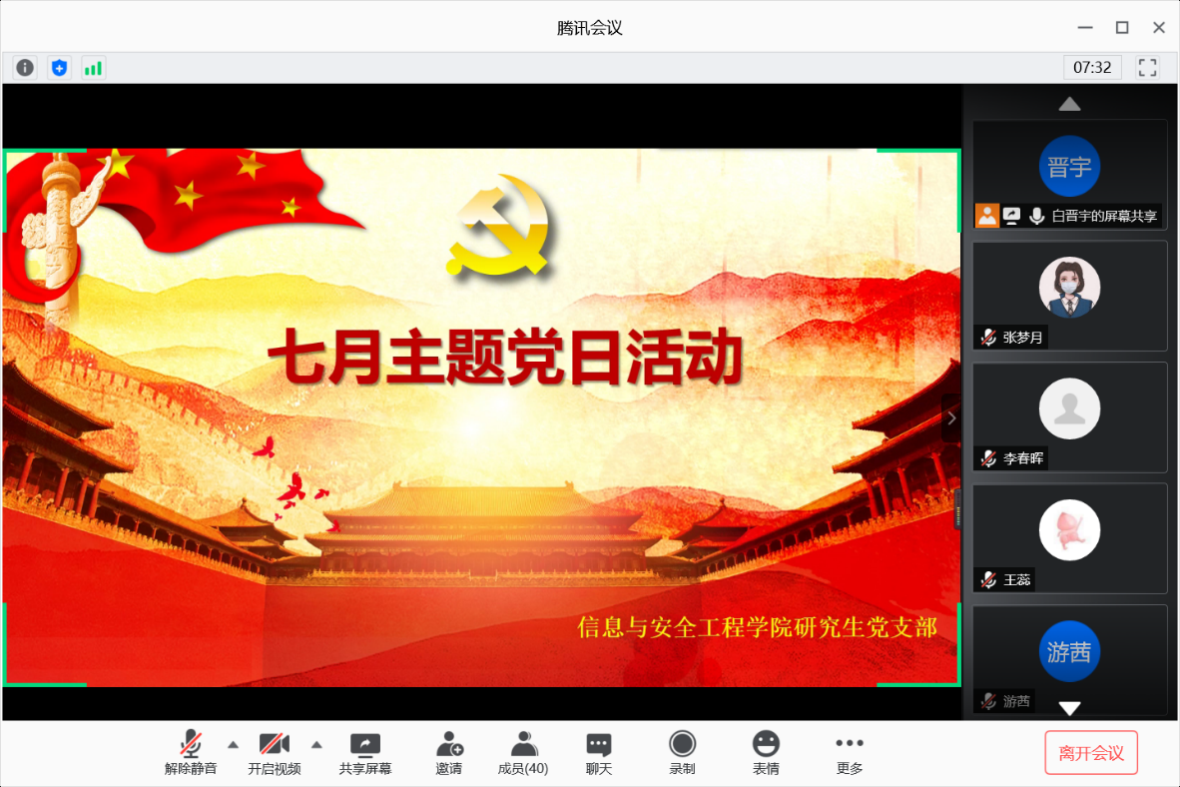 (通讯员:张梦月)2020年7月17日晚八点,信息与安全工程学院研究生党支部开展了“同上战役‘微党课’,共筑红色防火墙”支部主题党日活动。本次主题党日活动利用腾讯会议形式开展,会议由研究生第二党支部副书记白晋宇同志主持,研究生辅导员、研究生党支部书记付慧娟老师,以及研究生第一、第二党支部成员参加了本次会议。