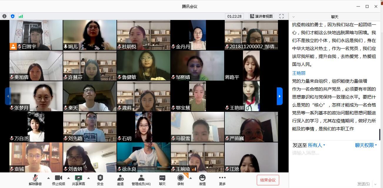 会议的最后,付慧娟老师对本次主题党日活动进行了总结。付老师首先对本次党日活动的学习资料进行了深入讲解,鼓励大家时刻关注党的政策以及国内外发生的重要事件,加强自身思想建设,提高思想觉悟。随后,她再次提到了新冠肺炎疫情期间武汉、湖北人民表现出的应用,全国人民展现出的团结,并结合亲身经历分享了自己的见解与感想。付老师提到,只有当一个国家遭遇重大磨难时,才能体现出一个民族的文化沉淀和历史底蕴。最后,付老师分享了观看战“疫”微党课的感悟。她提到,李可老师是“两神山”建设的参与者,而我们每个人也都是这段历史的见证者。李老师的讲述将人们带回那个新冠肺炎肆虐的时期,但疫情中紧张、伤感的情绪终将会被疫情结束后的蓬勃力量取代!